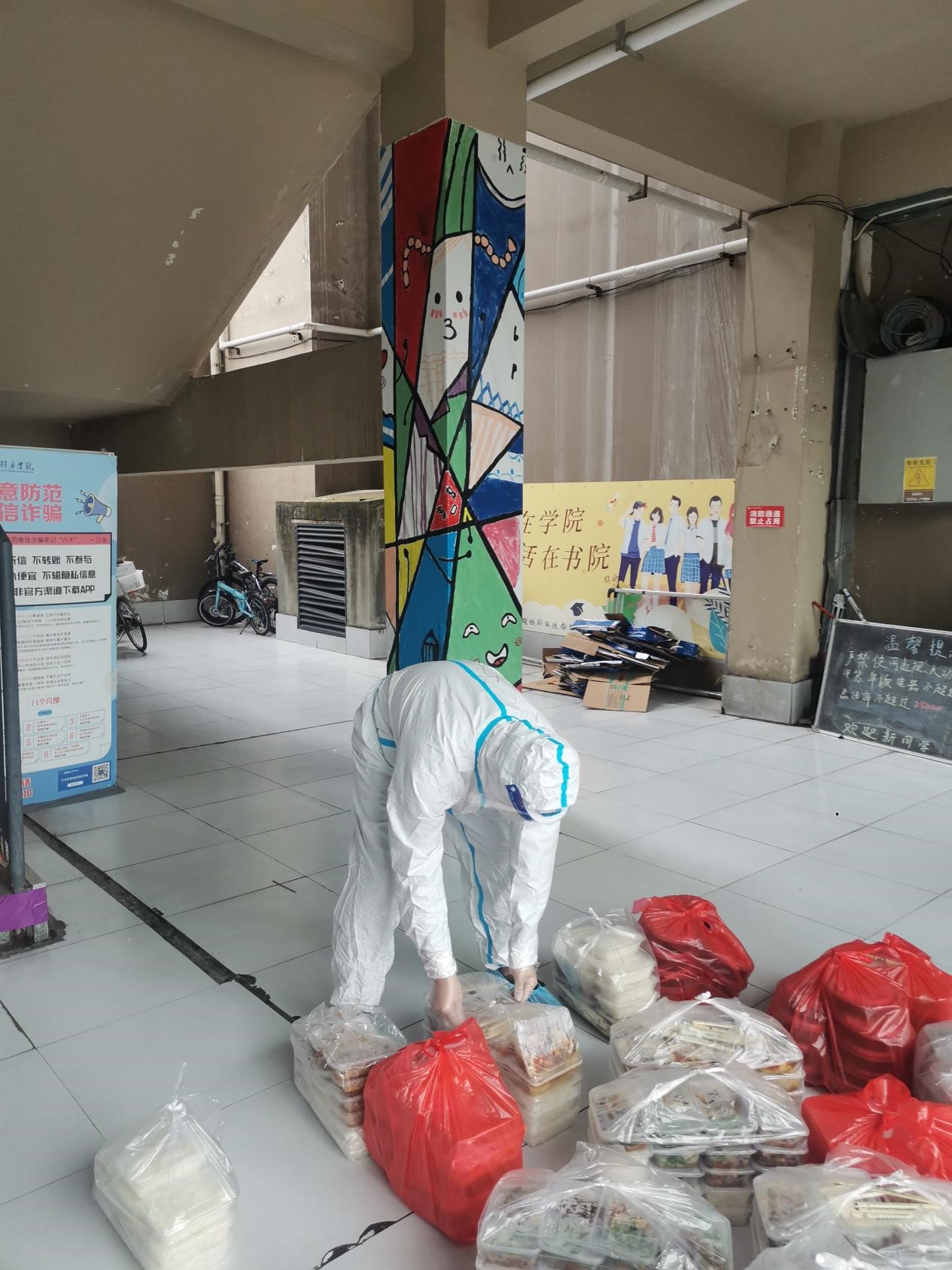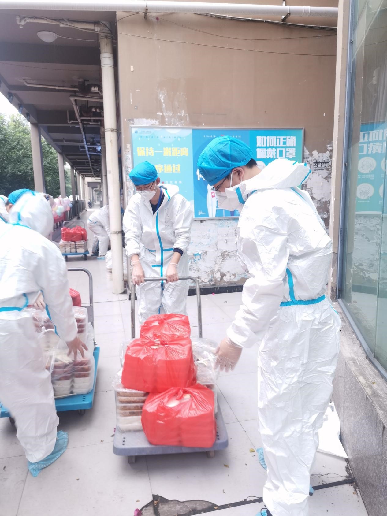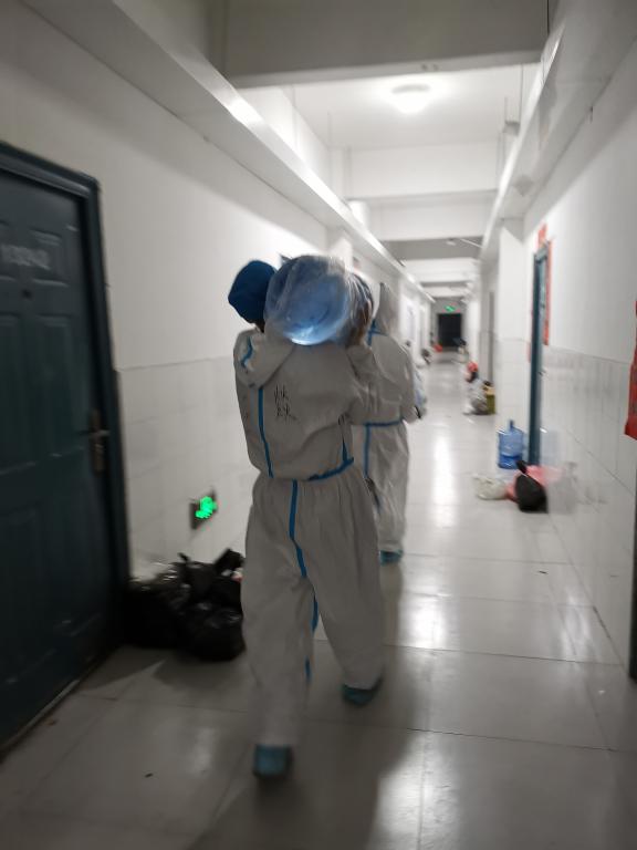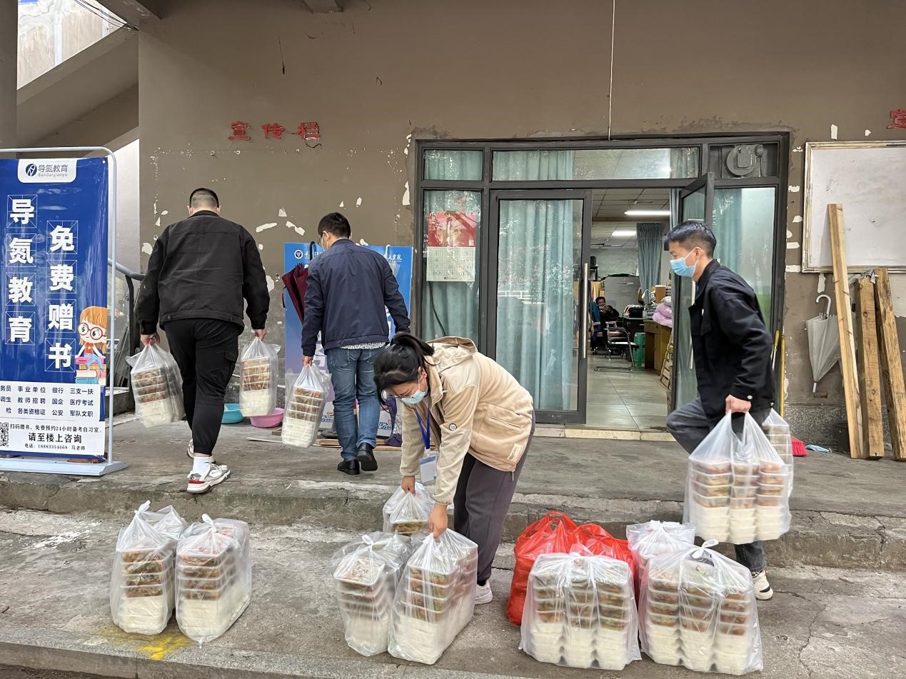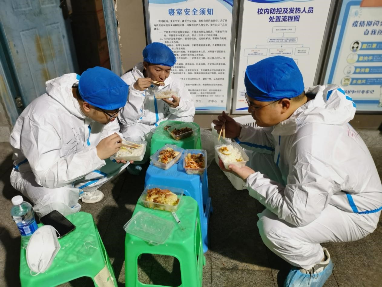 在这样严峻的形势下,我们的目的是要保证每一位学生都能够吃上热乎饭,要能保证他们的基本生活物资供应。教师志愿者们每天从早上七点开始,陆续的为学生们配餐,发放早餐,午餐,晚餐以及搬运第二天的物资等。一天下来,他们的衣服早已湿透,只有在吃饭的时间里可以短暂的休息一下,由于是临时管控,很多教师们睡的都是空空的教室或者是办公室里的桌子,但这些对他们来说都不是什么,他们想要做的,是一心为学生服务,当好学生的“后援团”。
