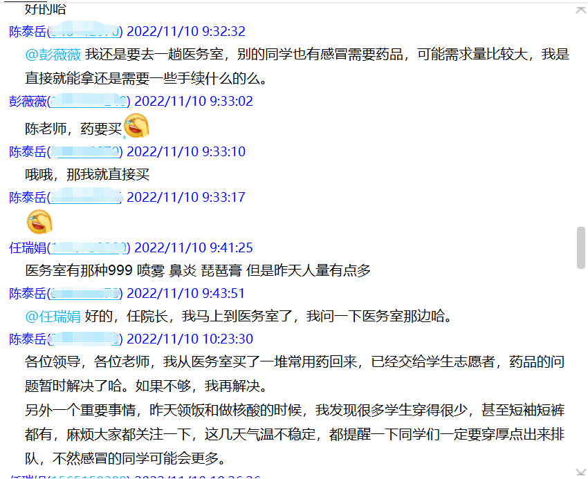 学生有需求了,老师们会第一时间向学院反馈,大家一起想办法解决学生面临的生活问题,书写着老师的责任与担当。
