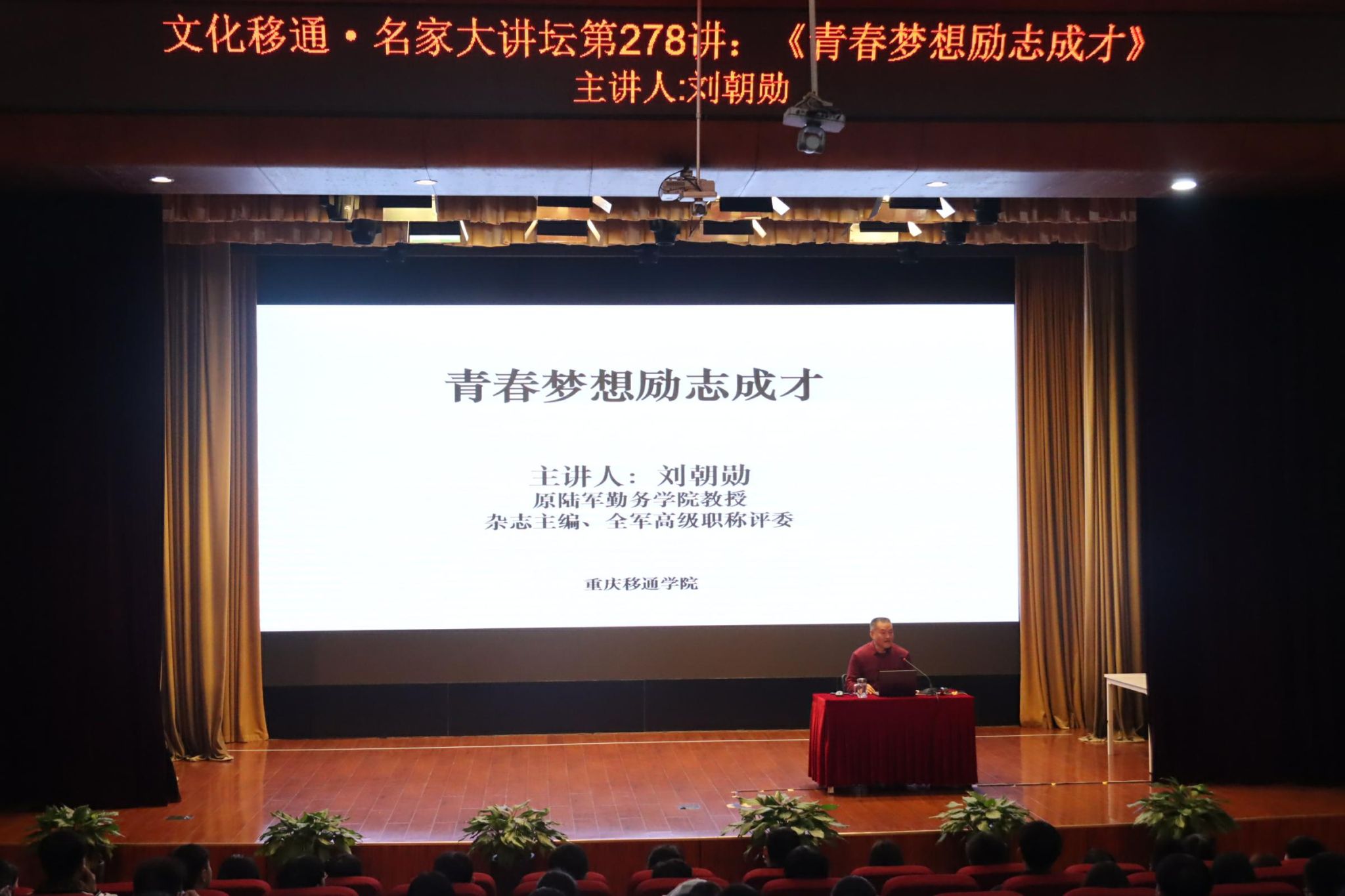 “人生没有标准答案,人生的路终究要靠自己的双脚去丈量。人不能两次同时踏入一条河流,青春的河流也只有一次。”3月27日晚19点,原陆军勤务学院教授,杂志主编,全军高级职称评委刘朝勋教授在下里巴人剧场与各位同学共同探讨有关于“青春、理想、奋斗”的话题。