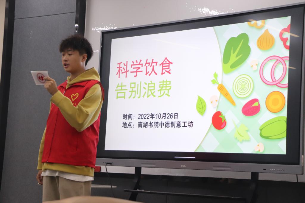“勤勤俭俭粮满仓,大手大脚仓底光。”为贯彻落实习近平总书记关于制止餐饮浪费的重要指示批示精神,引导广大青少年学习宣传生态文明思想,形成全社会公民科学饮食,节约粮食的良好风气。我校青年志愿者联合会于10月26日中午12:10在南湖书院中德创意工坊,以线下的方式开展“科学饮食,告别浪费”主题团日活动。本次活动邀请一位学长作为主讲人进行讲解,学生共计50余人一同参与。