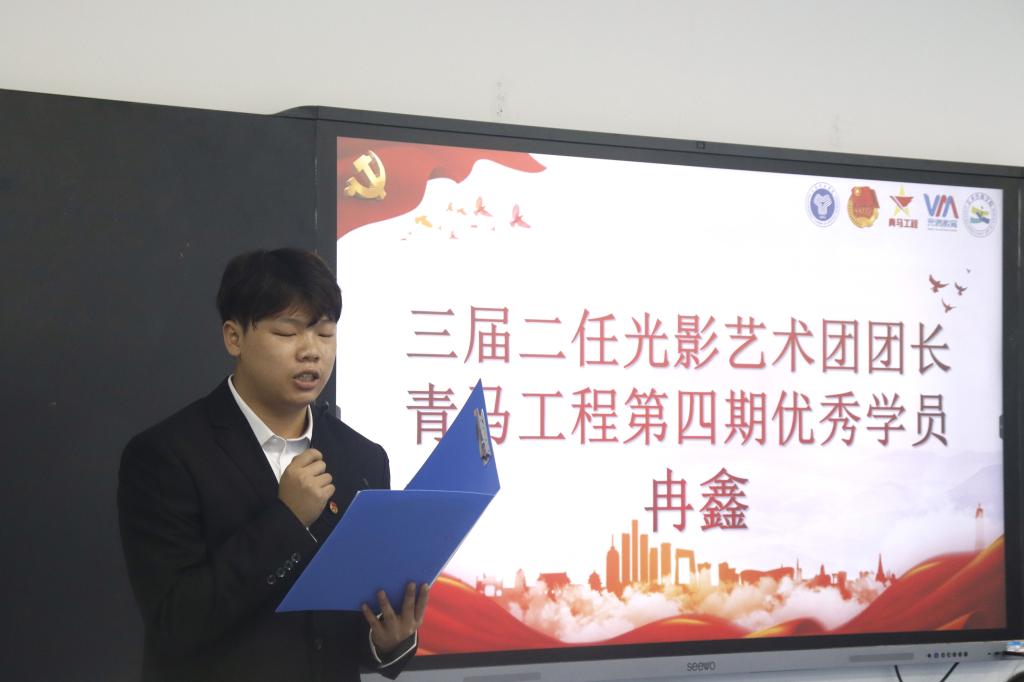 第四期“青马工程”完骨班优秀学员代表,现任艺术传媒学院光影艺术团团长冉鑫同学发言。他在发言中讲述自己在大学成长的经历,从上台讲话发抖到对活动现场完全掌控,在完骨班里不断脱变。他总结到,“学生骨干其实是一个短期目标,是一种方向,是进入陌生环境时迷茫的一座‘灯塔’。要想成为一位合格学生骨干,必须不害怕做事,要脚踏实地办事,明确自身任务和努力方向,清楚自己的职责,努力提高自己的组织管理能力,严守纪律,从小事做起。时刻保持一颗责任心,不管遇到任何事情都坚守本心。”