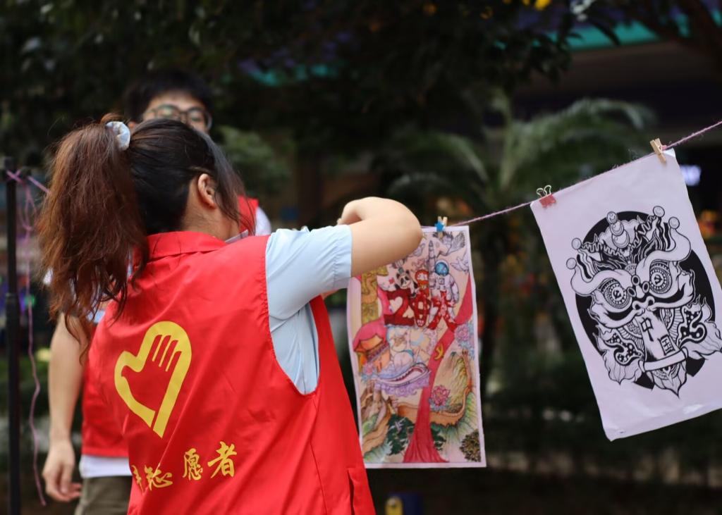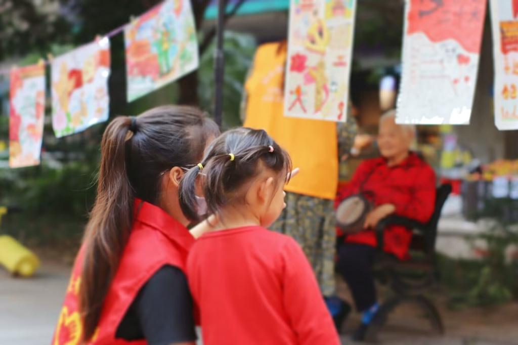 身穿红马甲的志愿者们将一系列优秀绘画作品一一固定在展架上,一幅幅布满中国红的图画在阳光下显得特别耀眼,这也透露出艺传学子的芊芊风采与专业素养。市民朋友们纷纷来到展架前,欣赏这动人的美丽画卷。随风飘动的画纸将绘画信号传递到小朋友的耳边,召唤他们来给童年涂上独一无二的颜色。