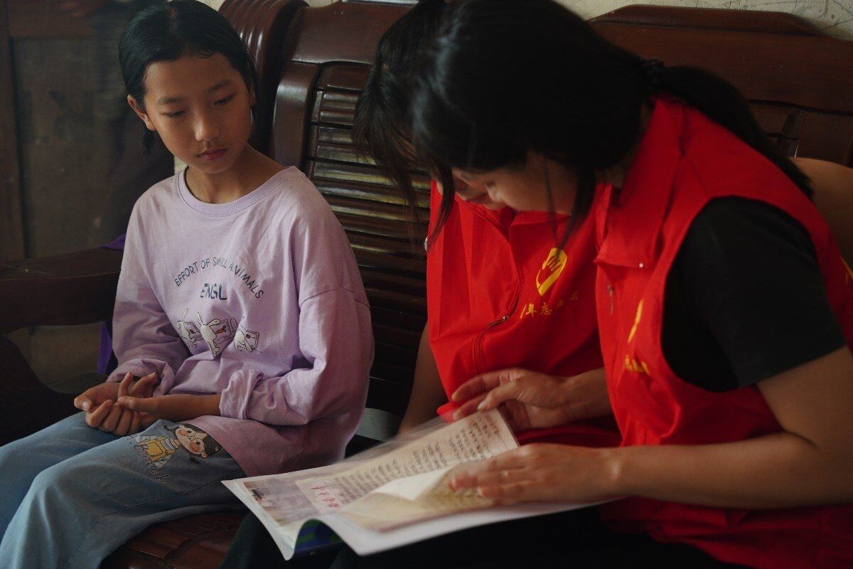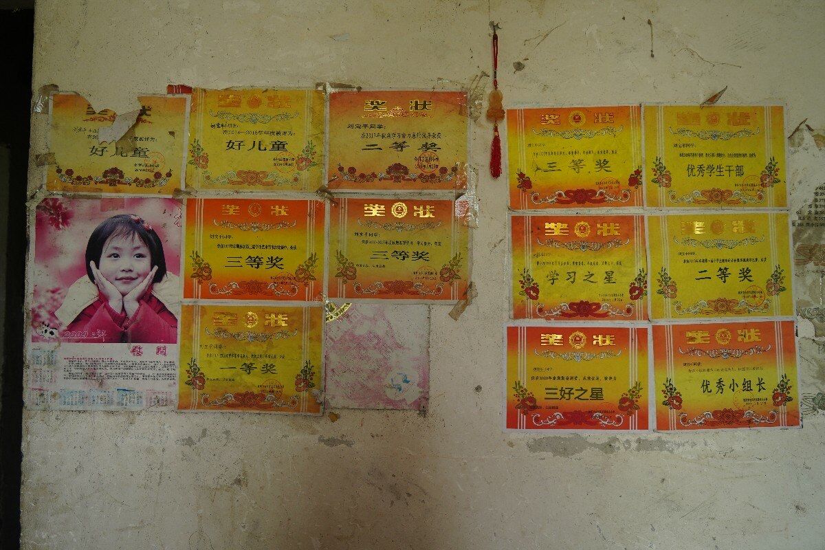 志愿者们和刘宝平小朋友一起交流学习经验,为她解答学习方面的疑难问题。一张张金灿灿的奖状贴满破旧泛黄的墙壁,给这个贫困的家庭带去不少希望。