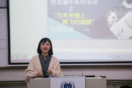 冉银用“金字塔”理论告诉同学们人生的每一个阶段目标和努力的相互作用和重要性。接着,她讲述了自己在北京与其他高校学生一起竞争、一起培训的日子,100人最终只进30人,正因为她了解自己和其他人的差距,所以,所有的东西她都是反复试验、论证,甚至每天观察别人的操作过程再去上手,哪怕每天最后一个完成,哪怕从未见北京的太阳和月亮,她都觉得那段时间的经历弥足珍贵。同时,学一个技能,有一技之长是一定有用的,在企业里保持神秘、会持续加分,接着她通过自己的职业转换故事向同学们传达了“不对自己狠社会会对你狠”的道理。