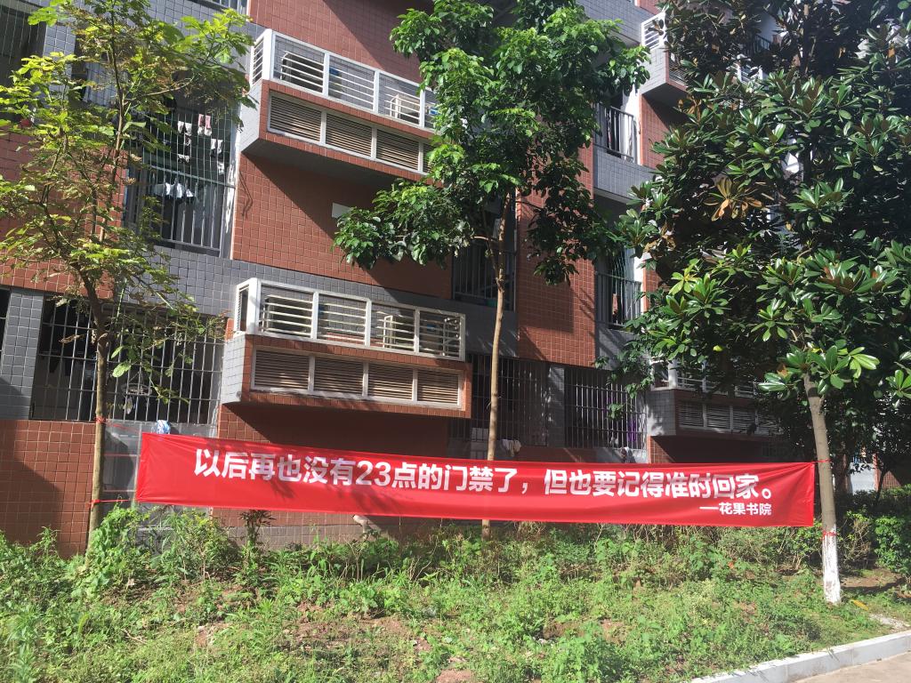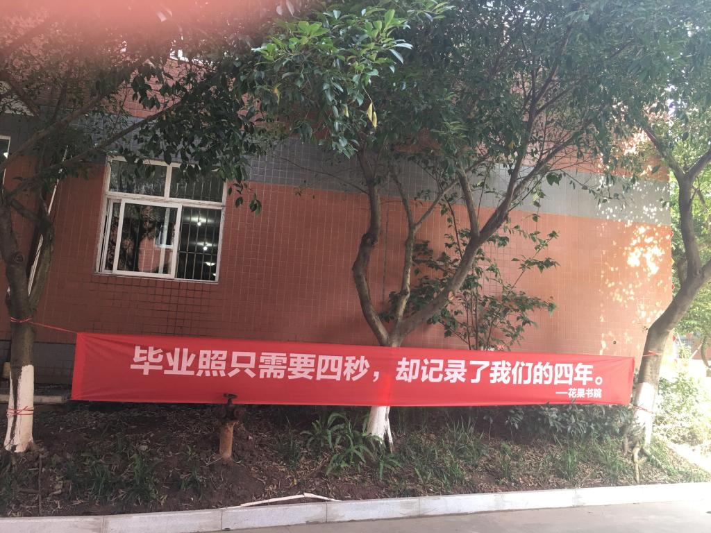 一条横幅短短一句话,却触动了内心深处。在书院区域我们拉了很多暖心而又幽默的横幅,比如“以后再也没有十一点的门禁了,但是也要记得准时回家”、“我轻轻的来,重重的走,挥一挥衣袖,带走一堆拜拜肉”等。许多毕业生们看到横幅或合影留念或哈哈大笑,旦这一字一句也触碰到他们内心的伤感。