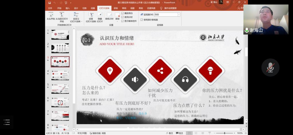 大学生心理问题日益严峻,为帮助同学们合理处理负面情绪,消除压力来源,激发生活的主动性、创造性,引导同学们正确释放压力和管理情绪,培养当代大学生健康心理。花果书院名誉院长谢海山院长于2022年6月8日15:00在腾讯会议开展了以“压力与情绪管理”为主题的花果书院院长精品公开课(第二十二期)。谢海山院长围绕“压力的来源”、“压力的利弊 ”以及“减少压力干扰的方法”等方面内容引导同学们保持积极的心态,妥善处理自己的负面情绪,培养分析、思考的习惯,理性应对生活、学习中的压力与负面情绪,促使同学们以积极乐观的态度迎接困难与挑战,便能乘长风破万里浪,抵达梦想彼端,成为更加蓬勃向上的充满朝气的花果人。