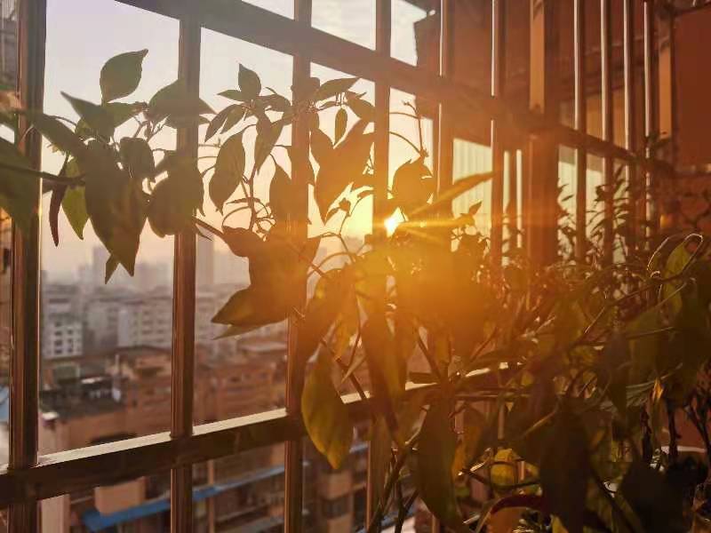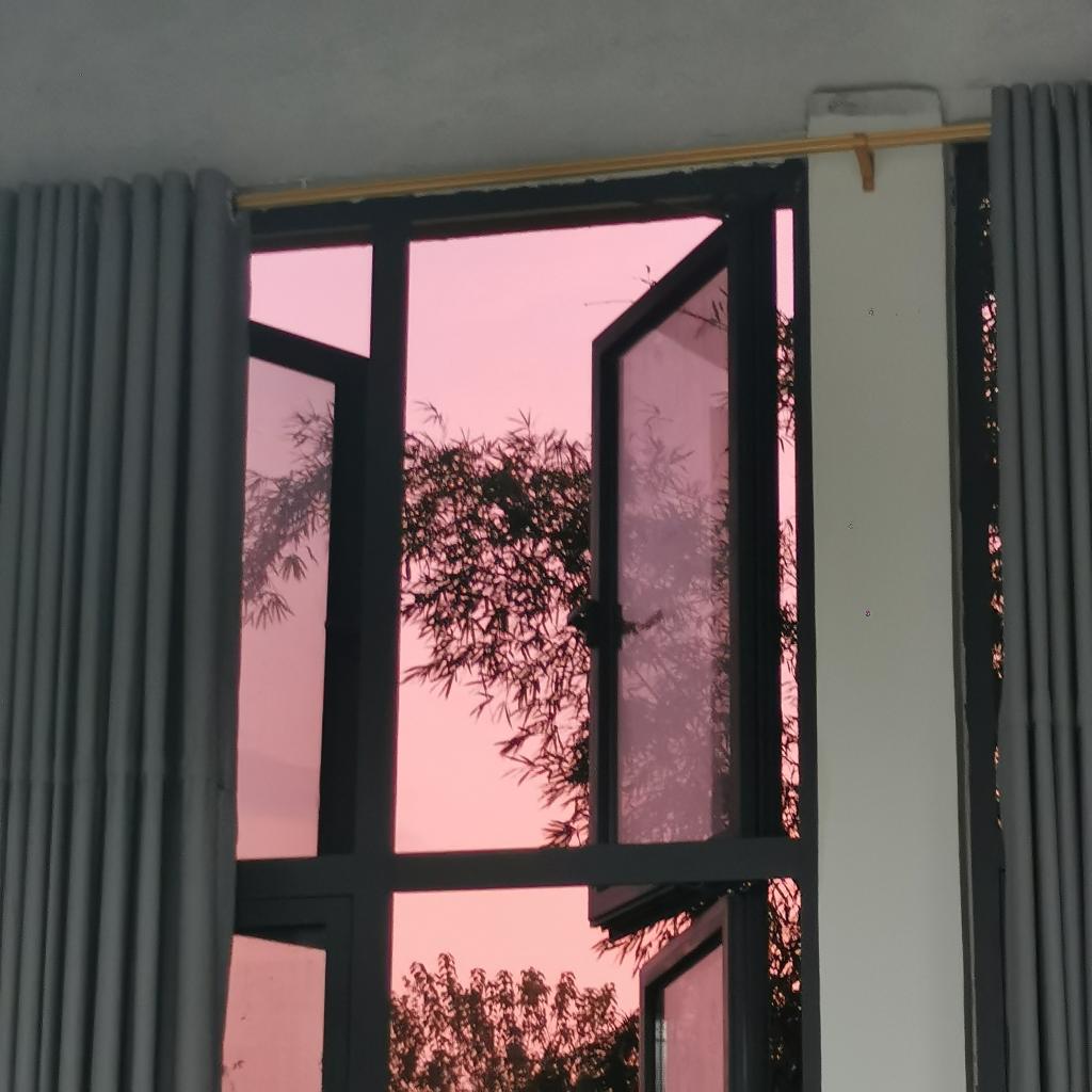 “如薄雾一般的夕阳洒在窗外,淡粉色的天空又增添些许梦幻。透过窗户,朦胧的飘洒进来,树叶好似划开天空的剪影,清冷却不着痕迹,随风揺曳,融于暮色。希望这景色可以温暖美好的你。”(王显艺同学)