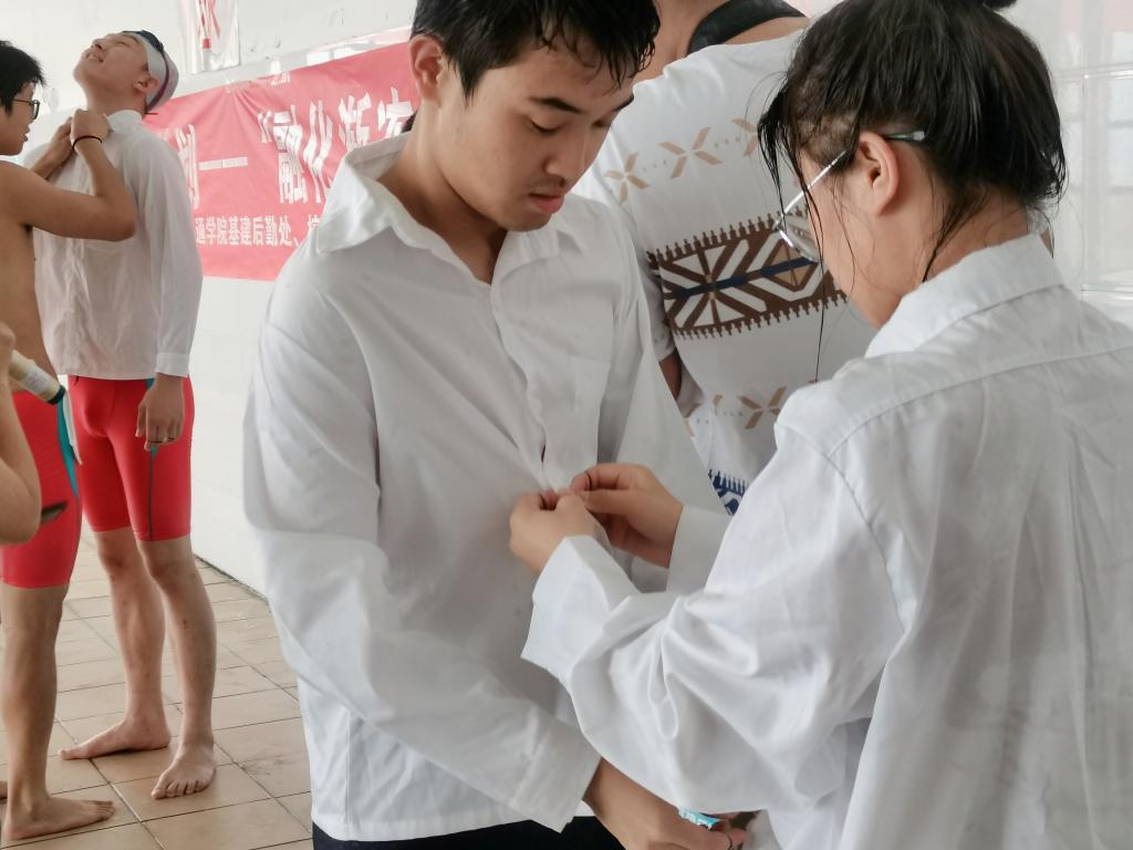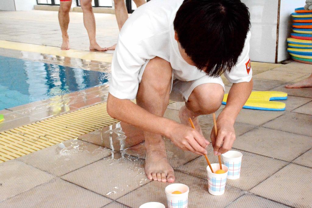 “轻功水上飘”环节,通过参与平衡感游戏模拟感ALS患者症状开始期可能手无法握筷,或走路会无缘无故跌倒等情况。各队伍分别派出一位参与者,首先挑战横渡泳池,在体力逐渐消耗后,再左手右手分执一根筷子将乒乓球进行转移。同学们或借助漂浮板、或奋力游泳,转移乒乓球时更是再现了身体逐渐变凉到肢体不便的初期体验。