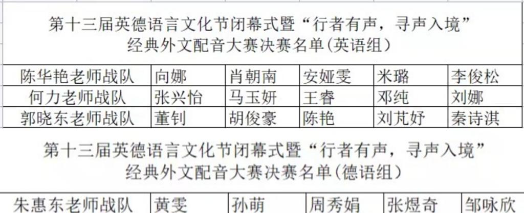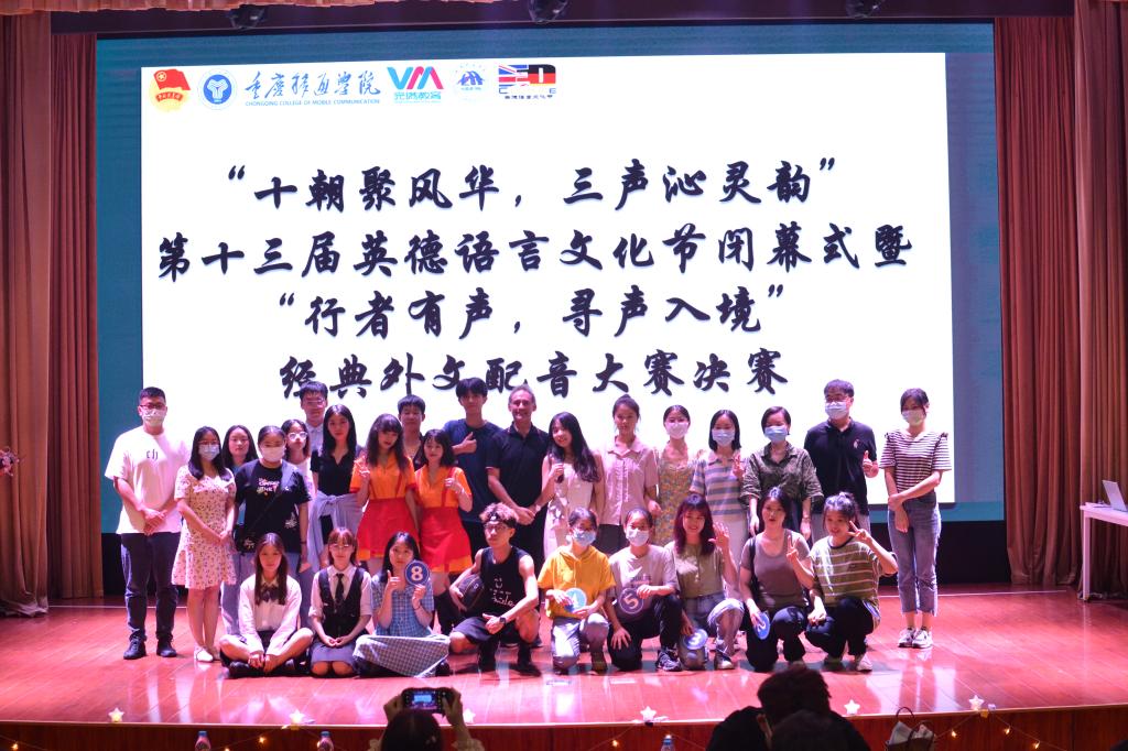 2022年6月8日14时,第十三届英德语言文化节闭幕暨经典外文配音大赛在下里巴人剧场圆满举办。本次配音大赛的评委有:外国语德语专业教研室主任熊光源老师、德语外教Elisa、钓鱼城科幻学院杜佳能老师、英语外教Clive、外国语学院甘伶俐老师、学生评委杨晓莉。