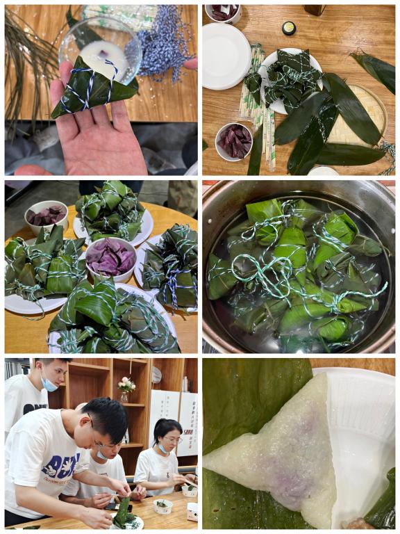 各地因地域文化不同,端午食粽也存在着内容或细节上的差异。活动过程中,陈老师通过北京、闽南、浙江等地粽子的形状风格和风味差异,为大家全方位呈现粽子全貌,拓宽同学们的生活视野。此外,活动现场还设有传统糯米粽和西米水晶粽的手工体验区域,师生共同沉浸式体验包粽子的全过程。活动过程中,师生之间互相帮助,分享与传授包粽子经验,裹粽叶、选配料、包形状、栓棉线等等,每一个步骤都蕴含着先辈们的劳动智慧,从“眼睛会了”到手脑并用,现场欢声笑语,一片其乐融融。