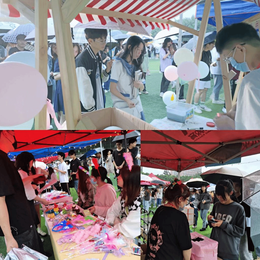 雨一直下,却并未淋湿大家的意趣。同学们举着雨伞,在淘宝街上驻足流连,在游戏点享受乐趣。伴着场上的氛围音乐,同学们参与活动的热情,像毕业生们难忘而精彩的青春,久久不曾散去。