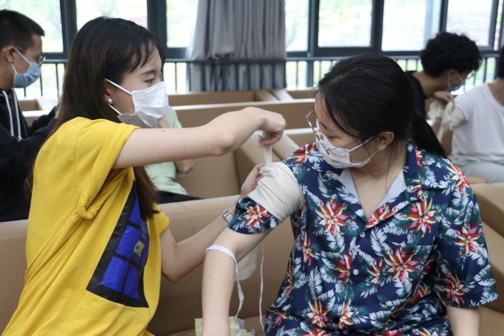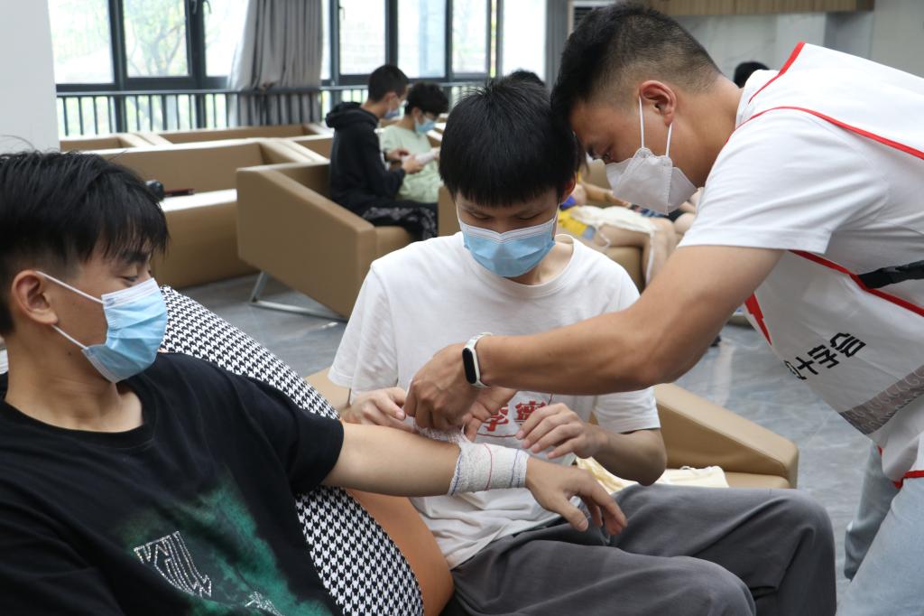 在同学们进行实践操作的时候,余老师认真观察同学们的包扎手法,并及时纠正指导。