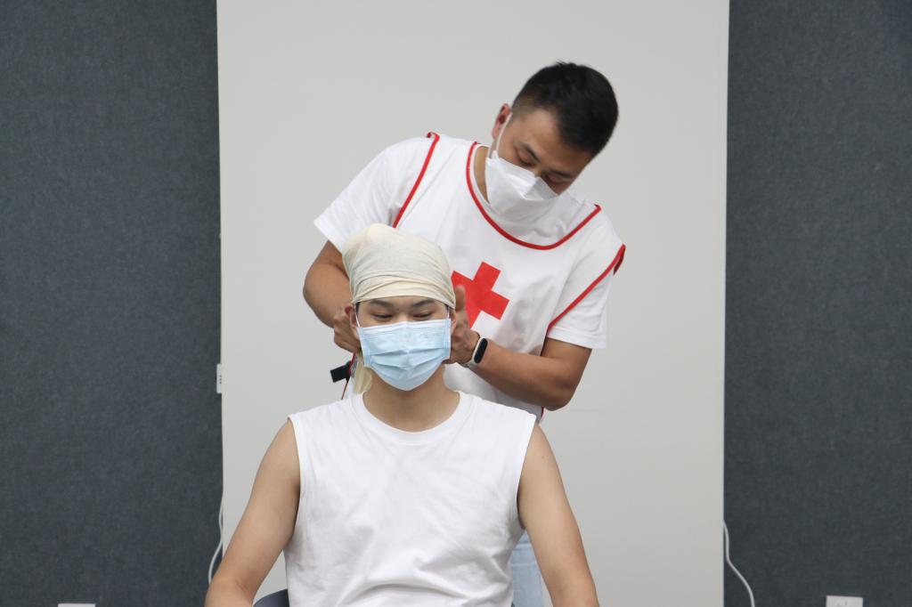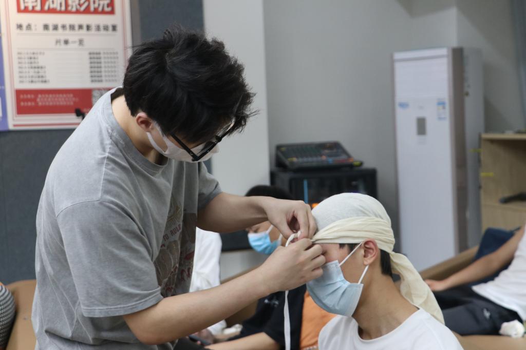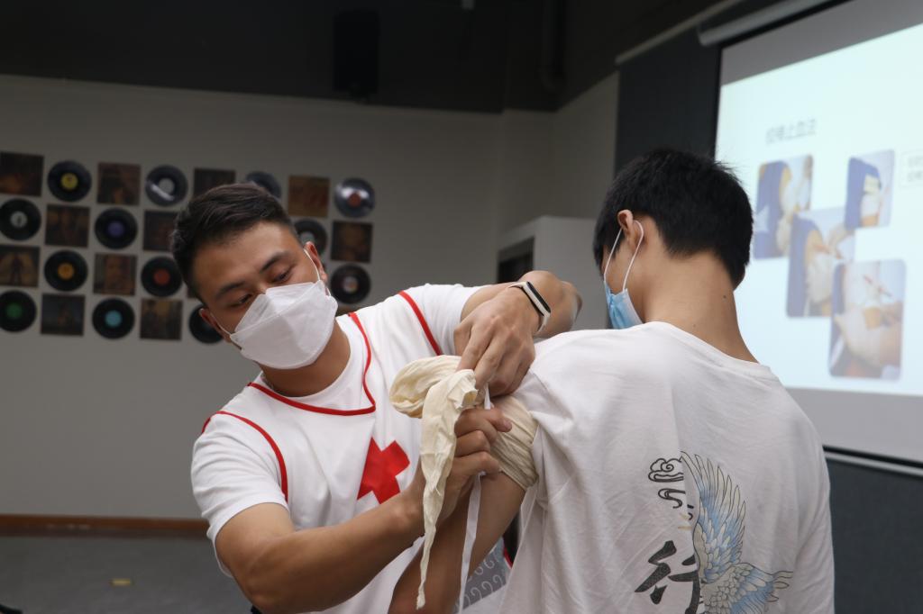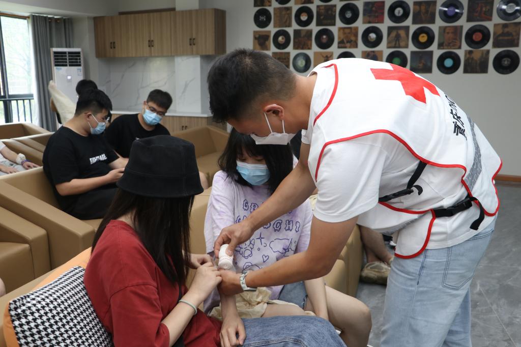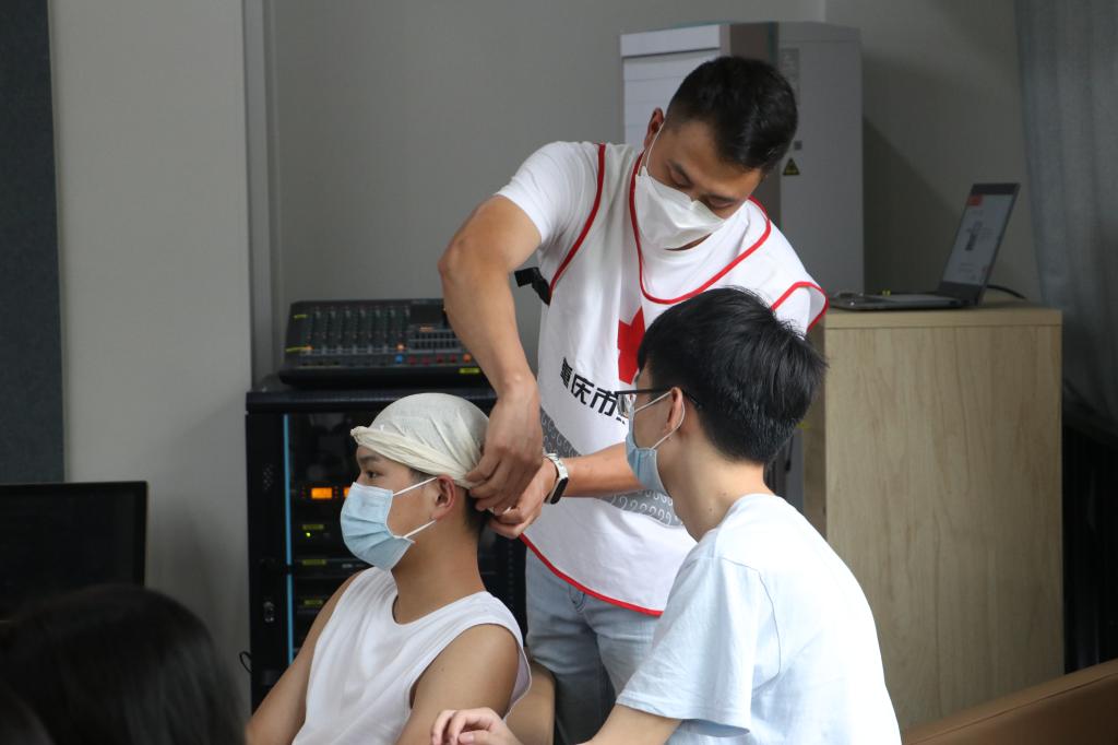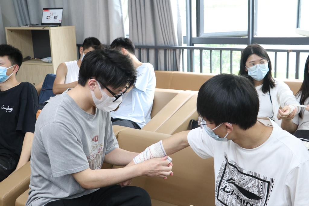 为了帮助同学们清晰直观地了解不同区域发生创伤后包扎方法和操作步骤,余老师现场示范了压迫止血法、螺旋反折包扎法和头顶帽式包扎法等外伤包扎方法。