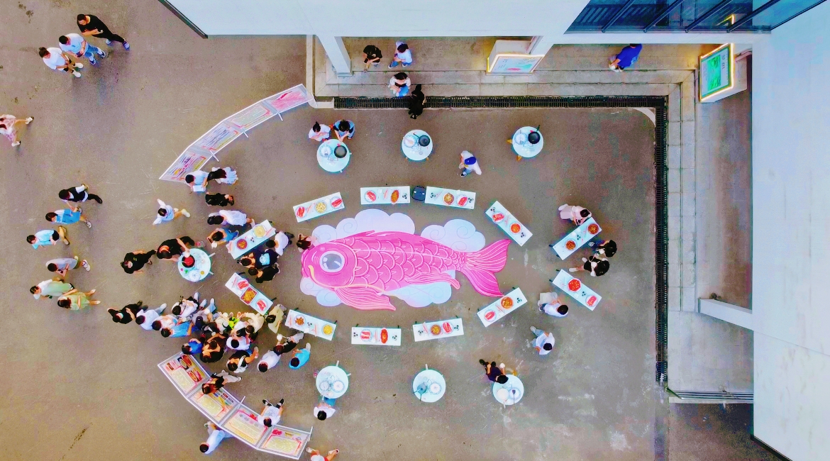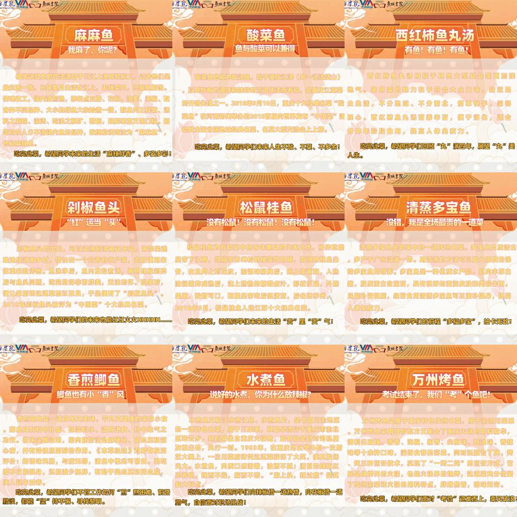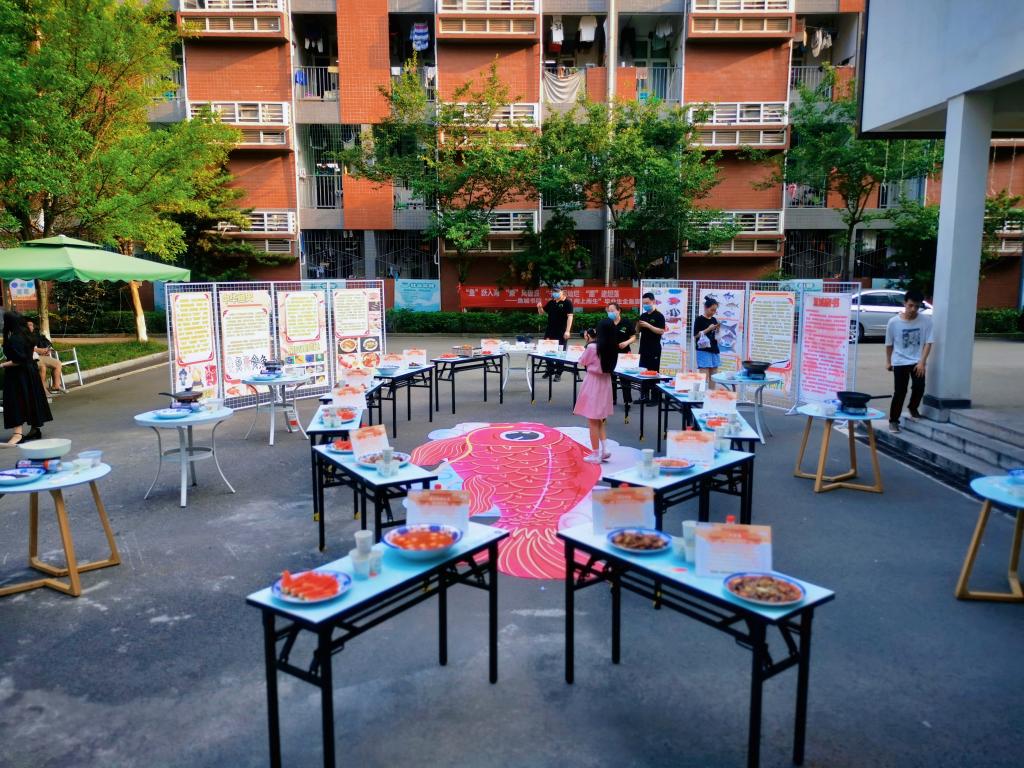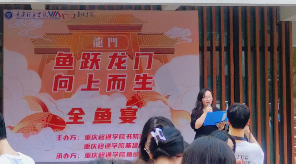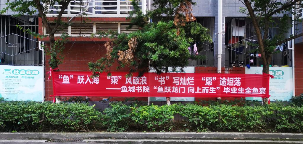 与原有庄重、正式的离院仪式不同,以毕业生“全鱼宴”为主题的离院仪式充满了“家园式”的温情仪式感:周边悬挂“藏头诗”的横幅祝福学子离开校园,享受未来灿烂人生;活动场地中央一条向外游动、带着龙须的大鱼象征鱼城学子毕业即跃过“龙门”,成就辉煌;对所有菜肴的“书院解读”都是鱼城对学子最深切的爱与祝愿,希望同学们带上书院的“包袱”去迎接人生下一个阶段的挑战。