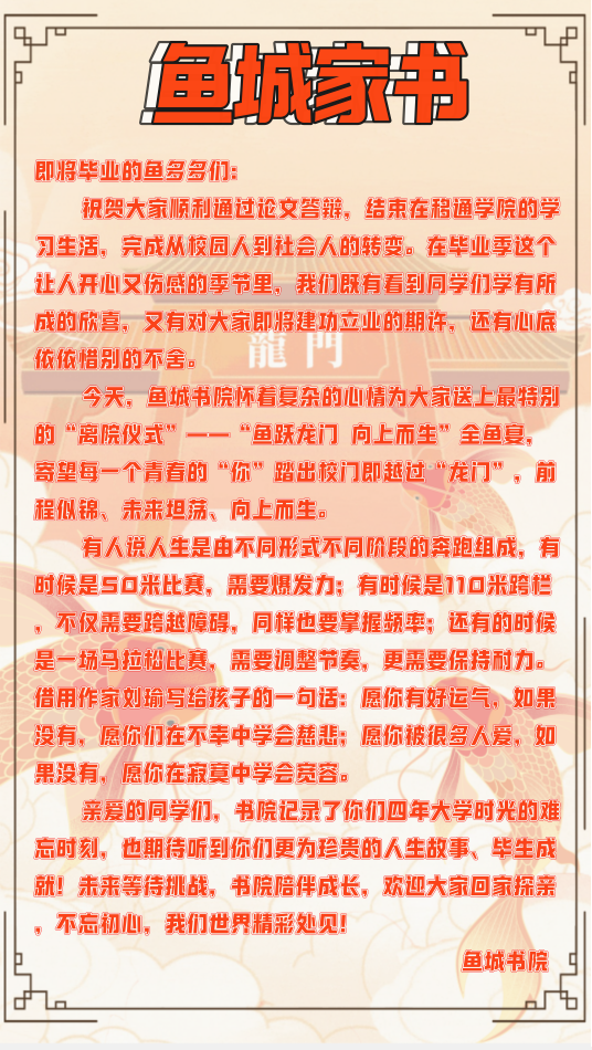鱼跃龙门,向上而生,既是全鱼宴的主题,也是书院对每一位毕业学子最深切的祝福。大学时光是人生中最重要的知识能力储备阶段,毕业意味着新的人生阶段开启。书院记录了学子们四年大学时光的难忘时刻,也期待听到同学们更为珍贵的人生故事、毕生成就。祝福选择考研深造的同学深耕知识和技能,在学术领域里出类拔萃;祝福求职走上工作岗位的同学钻研业务,早日成为行家里手;祝福每一个青春年少的“你”踏出校门即是跃过龙门,一路青云、前程坦荡。