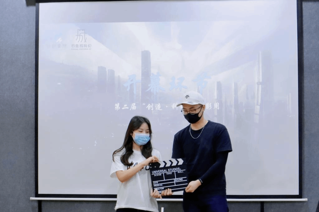 开幕式上,钓鱼城科幻学院电影部主管钟树葳老师向同学们介绍了科幻电影的赋予的未来的意义,讲述科幻电影带给我们的思考与创新。随后,钟树葳老师与汇江书院学生代表丁青同学手持场记板,一起为本届“创造.科幻”电影周打板开幕。
