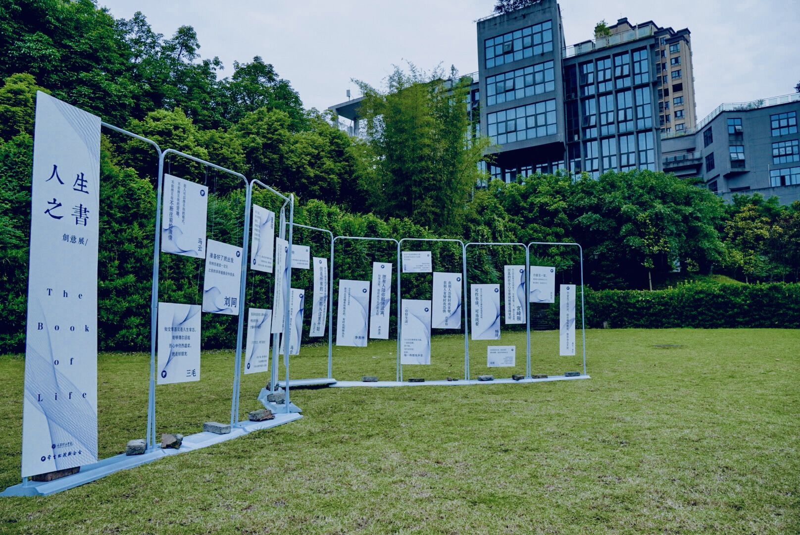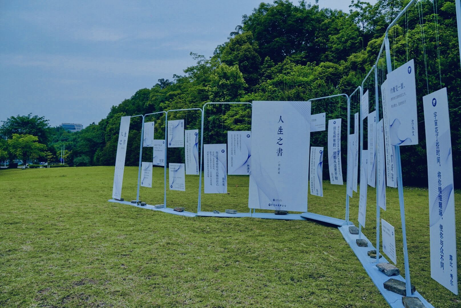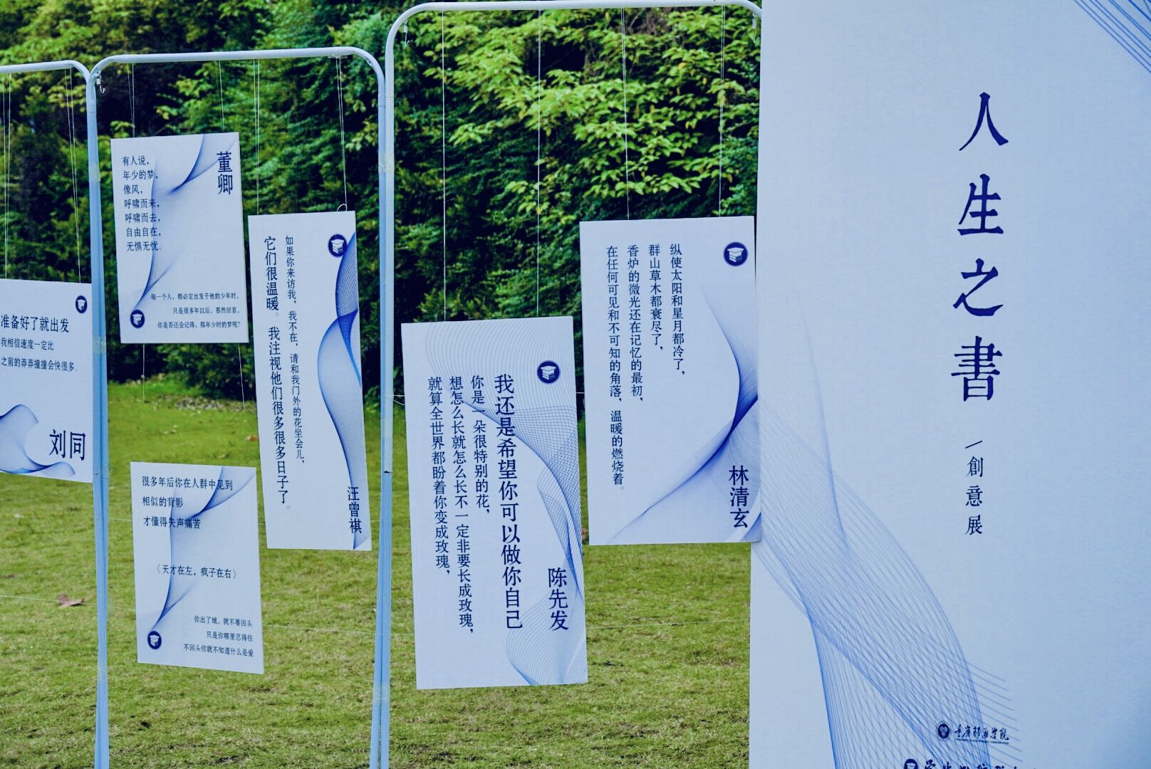 在湖畔大道旁草坪,设置“人生之书/创意展”,征集筛选出21名同学摘选的书中金句做集中展示,有大咖缔造商业传奇中的心路历程、有关于人生道路的点滴感悟、有激励在低谷振作向前的力量呈现,通过同学们的感悟征集、分享、交流,在展示中感悟名人大咖的精神与魅力,激发师生的阅读兴趣,通过分享人生之书,来感动“他”的人生。