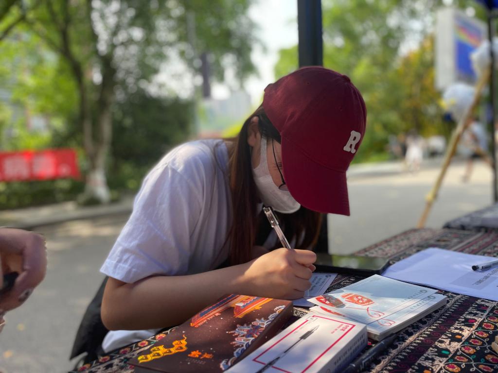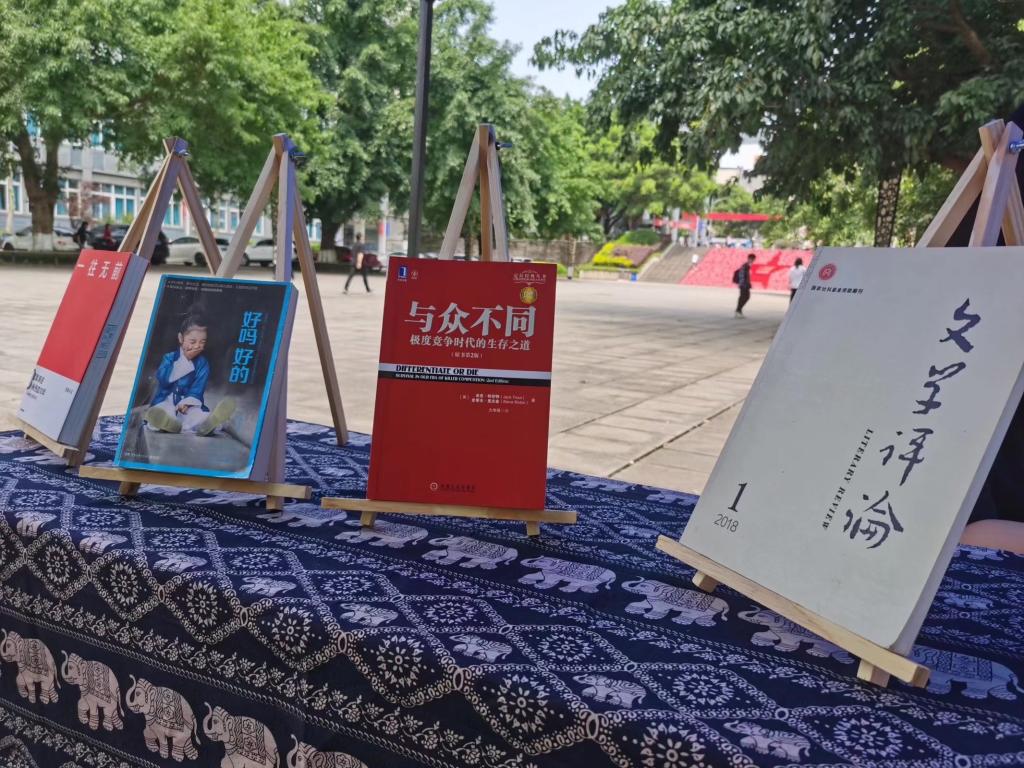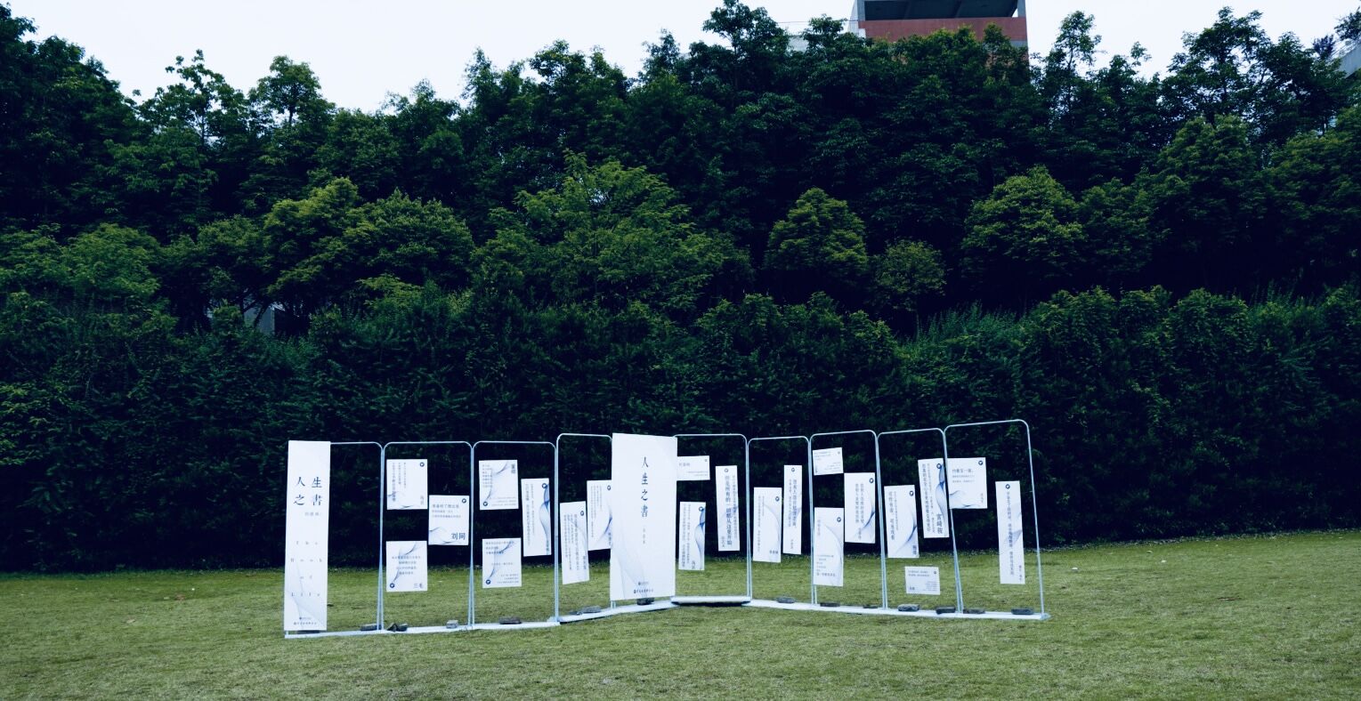 在湖畔大道旁草坪,设置“人生之书/创意展”,征集筛选出21名同学摘选的书中金句做集中展示,有大咖缔造商业传奇中的心路历程、有关于人生道路的点滴感悟、有激励在低谷振作向前的力量呈现,通过同学们的感悟征集、分享、交流,在展示中感悟名人大咖的精神与魅力,激发师生的阅读兴趣,通过分享人生之书,来感动“他”的人生。