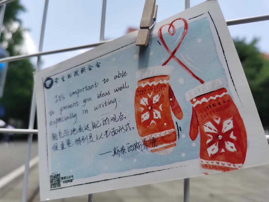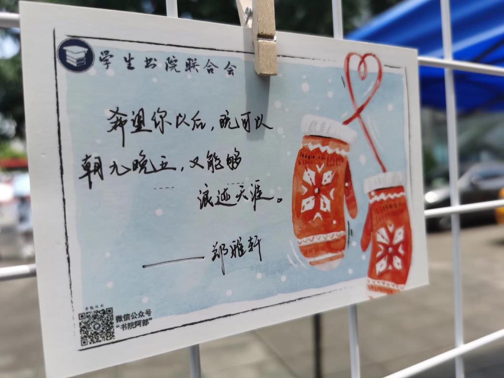 漂流图书馆旁摆放祝福留言板,在漂流箱中投入祝福语漂流卡片,记录同学们的读书心得、好书推荐、当下期许,用文字表达,用情感交流,以书籍传递故事,以故事形成圈层,32次书本传递,40余份留言打卡,疫情当下,翻书越岭,思想不曾停滞。