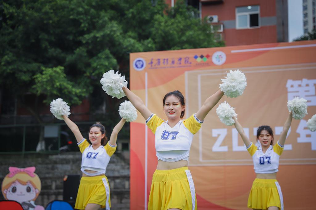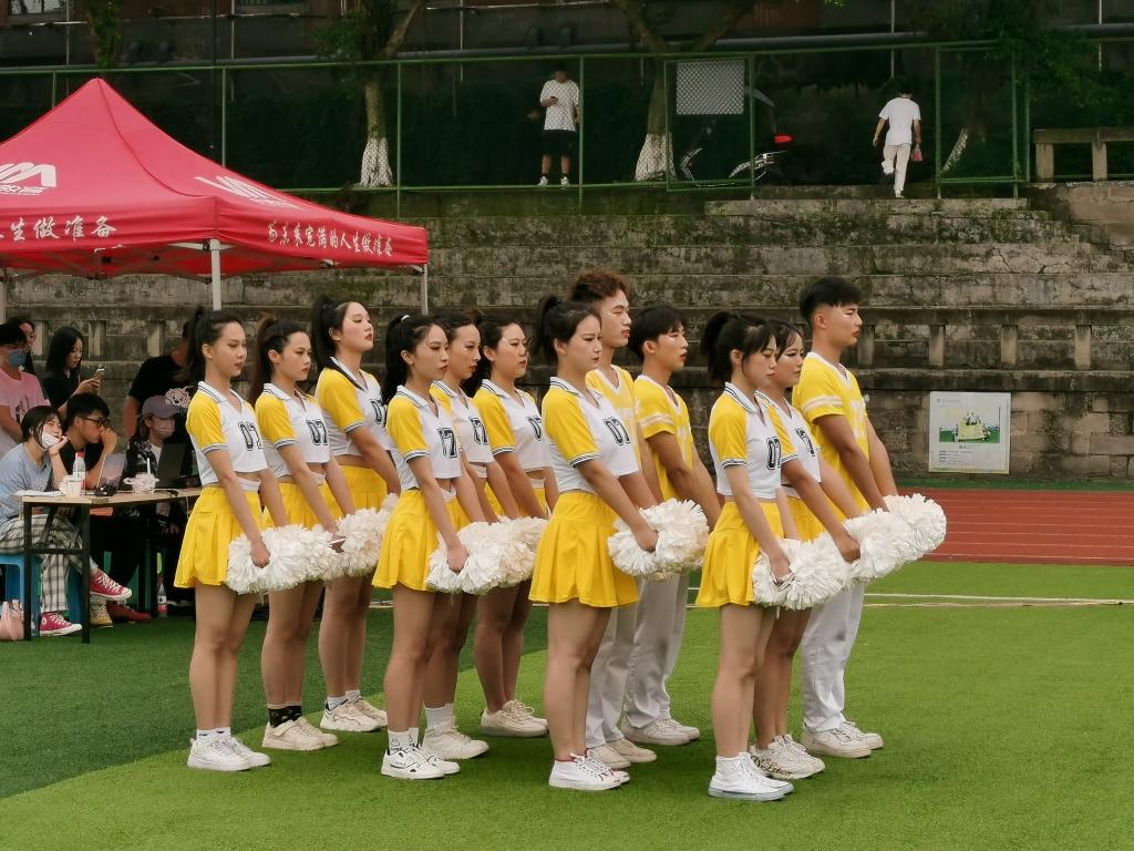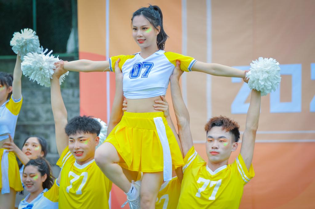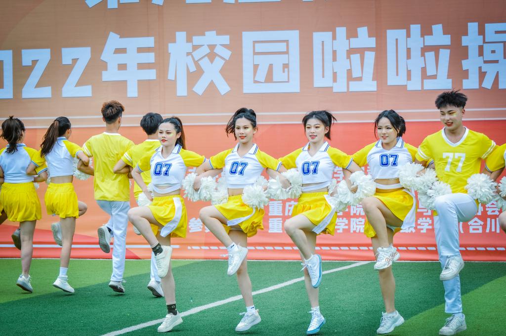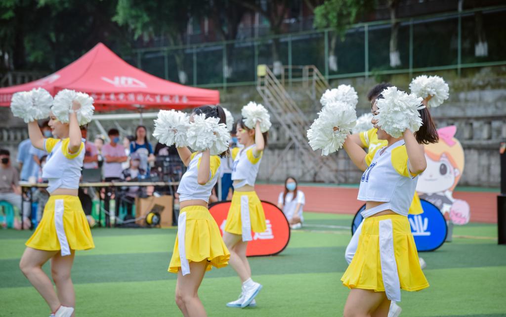 “手拿闪耀的花束,脚踏动感的节拍”,外国语学院啦啦操花球队步入赛场。整齐划一的动作、此起彼伏的队形、热情洋溢的笑容无不展现着他们的青春活力,一字马、托举等高难度动作也不在话下。他们身着代表积极灿烂、有创造力的黄色队服,用激情与活力燃爆现场气氛。由其自主设计剪辑的动感背景音乐也感染着现场的每个观众。