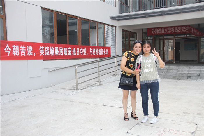 外国语言文学系新生叶青青同学(重庆 沙坪坝)和母亲在D区天渠书院合影