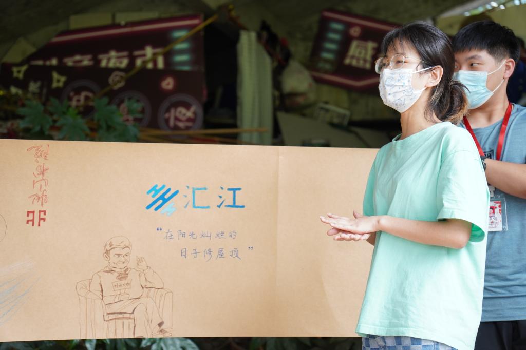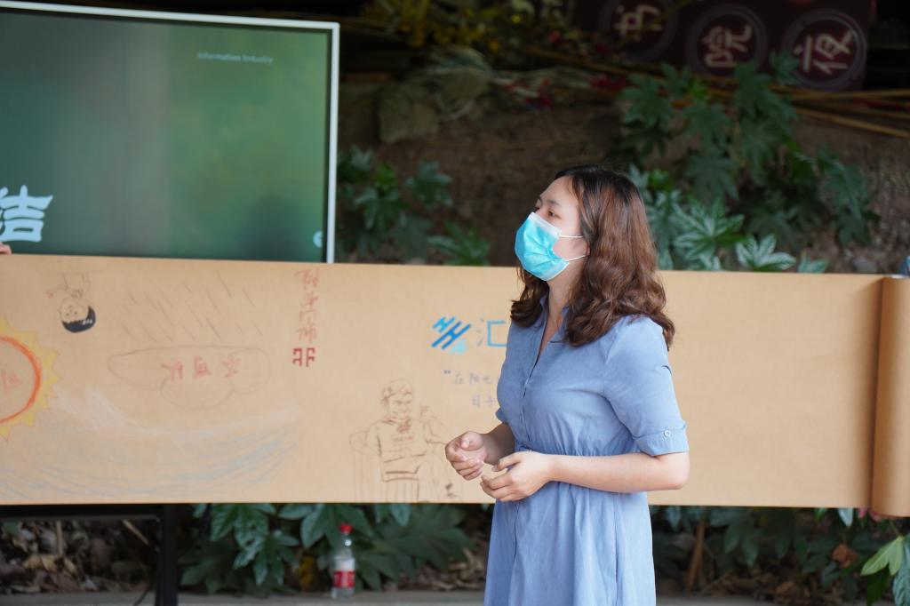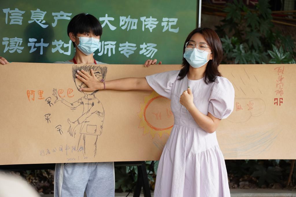 自由创作后,饱含书院师生创意与感悟的10米长卷映入眼帘,各书院师生代表对自己的作品进行精彩分享,南湖书院齐旭老师以马云与孙正义的相互赏识,结合南湖书院文化,引出智者只找对的人的精神理解;鱼城书院林森老师通五彩的“share”分享书院伴读计划的重要与阅读分享的快乐;廊桥书院滕壬鑫老师将马云与孙正义形象比作海绵宝宝与派大星,以他们的友谊与性格上的贴合生动地为全场师生带来一场“商业讲堂”;行者公园书院群张琦琦老师以马云极具辨识的演讲风格与经典金句带来大咖个人魅力的精彩分享。