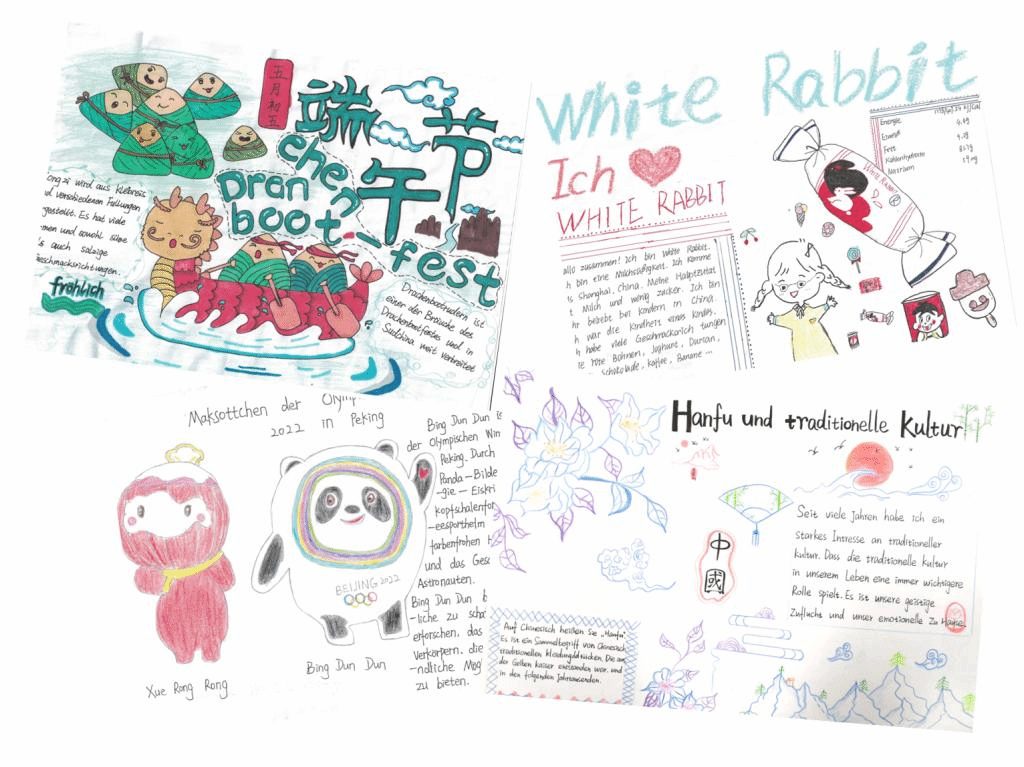 比赛以“中国优秀传统文化、地方红色革命文化、社会主义先进文化”等为题材,针对高、低年级组对作品分别提出相应要求,综合考察语言能力、思想内容和创新创意。同学们热情参与,在任课教师或学业导师的指导下,各显身手,有的用画笔和文字描绘即将到来的端午节,有的将刚刚过去的北京冬奥会以及冰墩墩作为灵感,还有的从细小之处着眼,介绍了经典的中国特色童年回忆——大白兔奶糖。