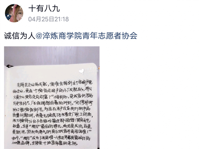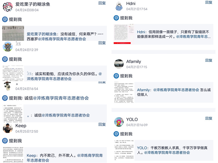 为提高青年学子诚信意识,在思想层面加强诚信理念建设,推广宣传青年信用体系相关内容,淬炼青协发出学习诚信相关知识的号召,通过每日打卡学习相关理论知识和名言警句,进而起到潜移默化的作用。自4月5日起,淬炼青协官方QQ每日收到数次知识打卡提醒,诚信微打卡活动人气火爆。打卡期间,不少同学表示在每日学习的过程中,诚信思想随之深入理念,在日常待人接物中自觉流露。