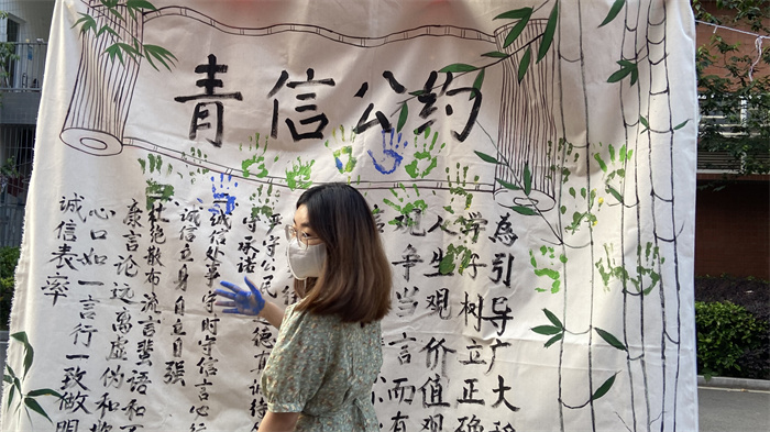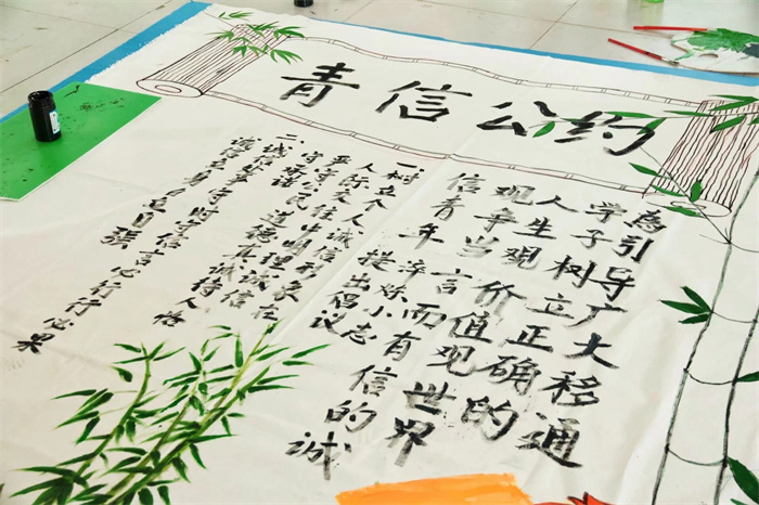 立青信公约,促诚信校园。为引导广大移通学子树立正确的人生观、价值观和世界观,争当言而有信的诚信青年,在校园内营造良好的诚信氛围,淬炼青协提出青信公约倡议,内容涵盖个人诚信品德修养、社会诚信处事、维护和宣传诚信社会环境等方面;邀请艺术传媒学院美“益”约志愿服务专项支队为青信画布增添色彩,画布上青竹丛生,扎根遍地,高耸直立,欲有破晓之势,熊猫与诚信商商憨厚可爱,青信公约真诚醒目,淬炼青协以青信公约为引,助力构建诚信校园。