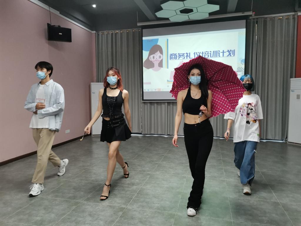 在取得一鸣惊人的成绩之前,必先做好充足的准备工作。活动开始前,为了呈现一个好的舞台金老师和同学们都铆足了劲准备,穿着惊艳的服装,画着精致的妆容,带着不同的道具闪亮出场。从多彩时装、国潮古风到经典礼服等服饰的独特性,到高跟鞋、折扇、鲜花等应景道具丰富性,再到男生选择女步的坚持与自我突破,每一位礼仪爱好者都勇于突破自我,克服10厘米高跟鞋的困难大胆展示自我魅力,将形体礼仪的魅力表达的淋漓尽致;也是在热爱面前永不止步的决心让他们得以从容优雅地走在舞台上,在每一次的转身回眸中找到礼仪之中美的体验。