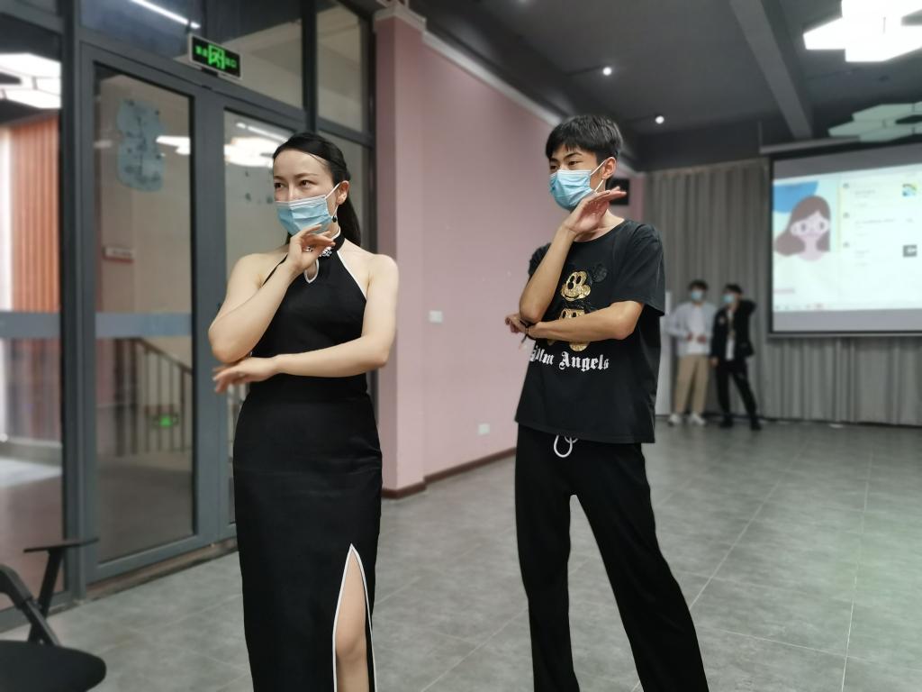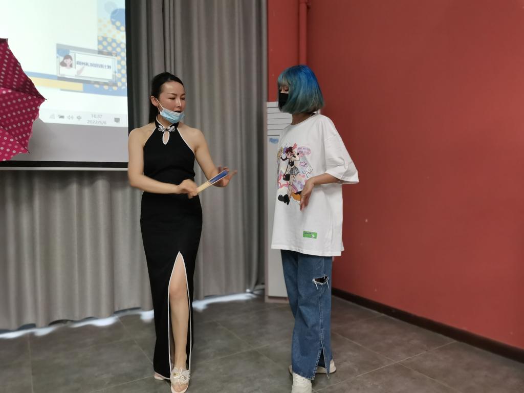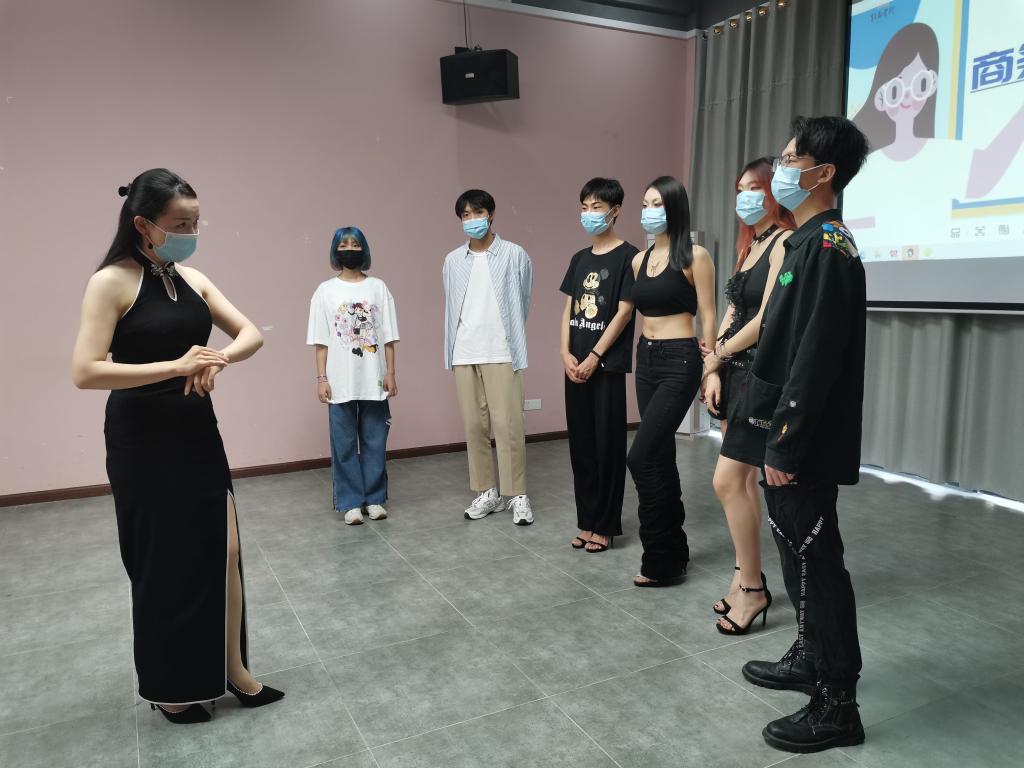 “穿着不同服装则要注意不同步幅、后撤步要稳准快、开扇要优雅流畅、大幅度动作中仍需要注意衣服的整洁平整。”活动过程中,金姝妤老师带领同学们在现场进行了“时装、国潮、礼服”三种不同风格的模拟走秀,对同学们三种走秀风格的变化和细节把控进行深入分析,也针对实训过程中同学们的走路姿势和步幅大小进行了一对一指导,帮助同学们改善体态的同时注重细节的呈现。通过金老师全面细致地指导及建议,帮助同学们掌握了适应不同主题的风格动作,让同学们在舞台上更加自信从容地展示自我。