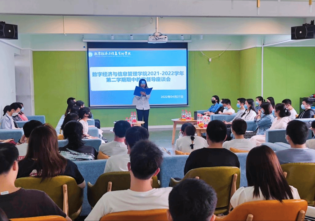 为进一步落实本学期教学质量评价工作,深化教学改革,提高教学质量,增强学风建设,更好地听取广大学生在校全面深化改革过程中对教学、管理、服务等方面的意见和建议,增强工作针对性,提高服务学生效能。数字经济与信息管理学院于4月27日16:00在双栀书院多功能影音室开展2021-2022学年第二学期期中教学座谈会。出席此次座谈会的嘉宾有数字经济与信息管理学院副院长刘贵容教授,数字经济与信息管理学院副院长任瑞娟老师,思政教学部代表杨勇老师,团委骨干老师肖哲老师,教务处孙亚栋老师,数理教学部陈本菊老师、李淑香老师,通识部教师代表李娇老师,学生处吴雷方成老师,外国语学院曲美玉老师,淬炼商学院王草老师,数字经济与信息管理学院周梦娇老师、王哲老师、团总支书记马莉老师,任课老师代表以及我院各年级各专业学生代表。