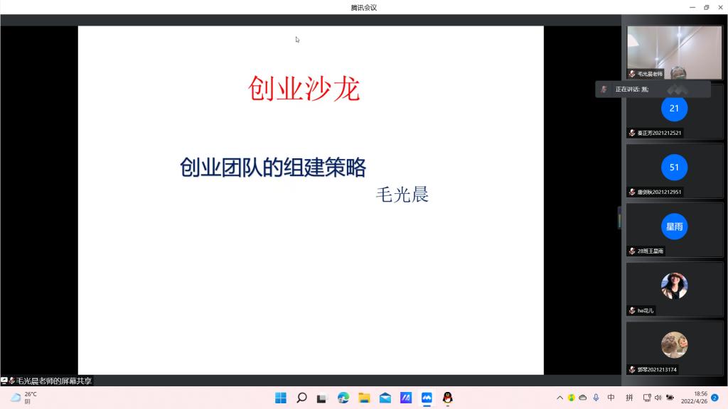 团队型创业的成功率高于个人型创业,一个优秀的团队对于创业的成功起着举足轻重的作用。为促进商院学子对创业团队组建原则和策略的认识,2022年4月26日晚上19:00,由就业创业指导与服务中心主办、淬炼·国际商学院就业助理团承办的“大学生创业团队组建的原则及策略”——淬炼·国际商学院第74期创业沙龙活动。本期创业沙龙特邀请到校就业创业导师库成员毛光晨老师来为商院学子分享创业团队组建的原则及策略。