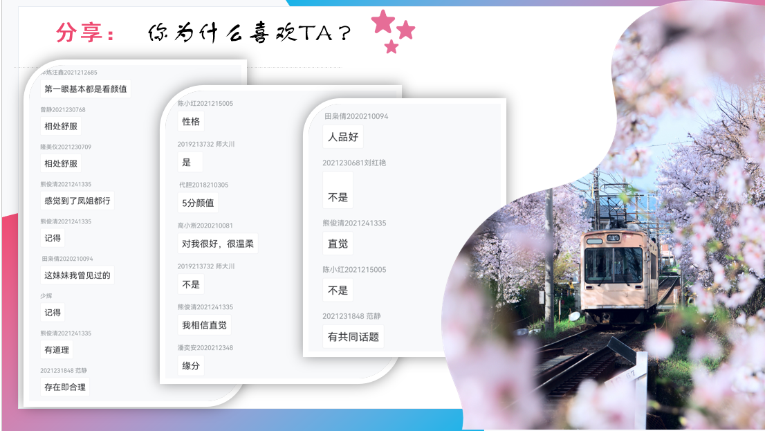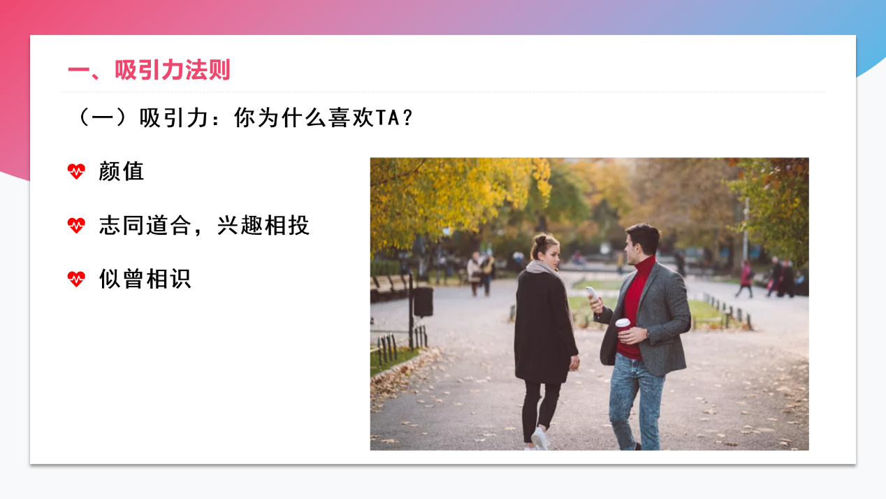 分享会伊始,郑老师在简单的自我介绍后,从建立关系的第一步出发,通过提问“你为什么喜欢TA?”,迅速吸引了同学们的注意力。同学们各抒己见,有的看重相处舒适,有的欣赏他人性格,更多的同学表示还是因为颜值、感觉等原因。郑老师也从“颜值、兴趣相投、似曾相识、近水楼台先得月、一见钟情” 这些表象出发,向大家一一介绍。在这些表象的背后,吸引力的本质是奖赏,也即,他人的出现对于我们有奖赏意义。影响吸引力的奖赏可以是与他人交往产生的显而易见的愉悦,也可以是仅与他人有关的微弱的间接的奖赏。