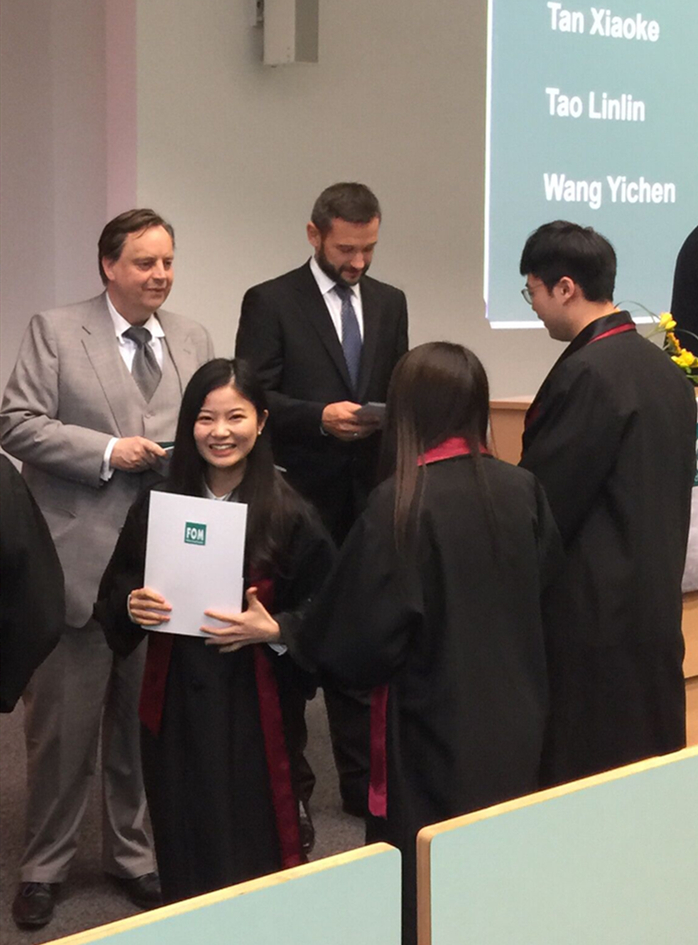 谭小珂:最大的收获就是在攻读德国Fom大学硕士的道路上,持之以恒的地不断提高英语能力,同时加深了对ifrs国际会计准则和公司财务的认识。而且在这几年时间里,结识了五湖四海的朋友们拓宽了自己的朋友圈,让自己的人际圈更加国际化。