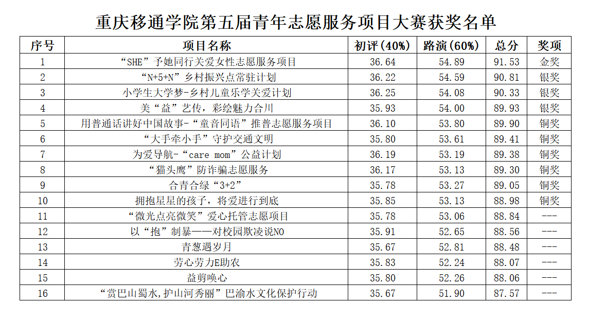 重庆移通学院第五届志愿服务项目大赛的顺利举行,进一步促进了更多更好的志愿服务项目在我校落地实施,激发了移通学子参与志愿服务的积极性,期待有更多的有志青年加入志愿者的队伍,打造精品志愿服务项目,将志愿精神播撒到每一个角落。