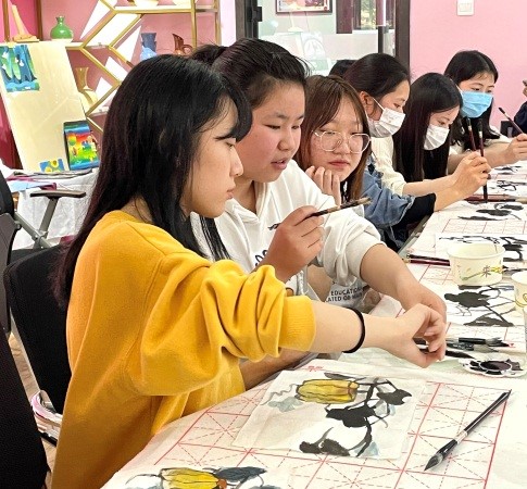 欢愉的时光稍纵即逝,两幅艺术创作之后,同学们又将暂时告别这一次国画之旅,但是喜爱的心不会停止,在闲暇之余,她们也会提起画笔投身于艺术。最后,闫公博老师与同学们将对国画的喜爱保留在合照之中。