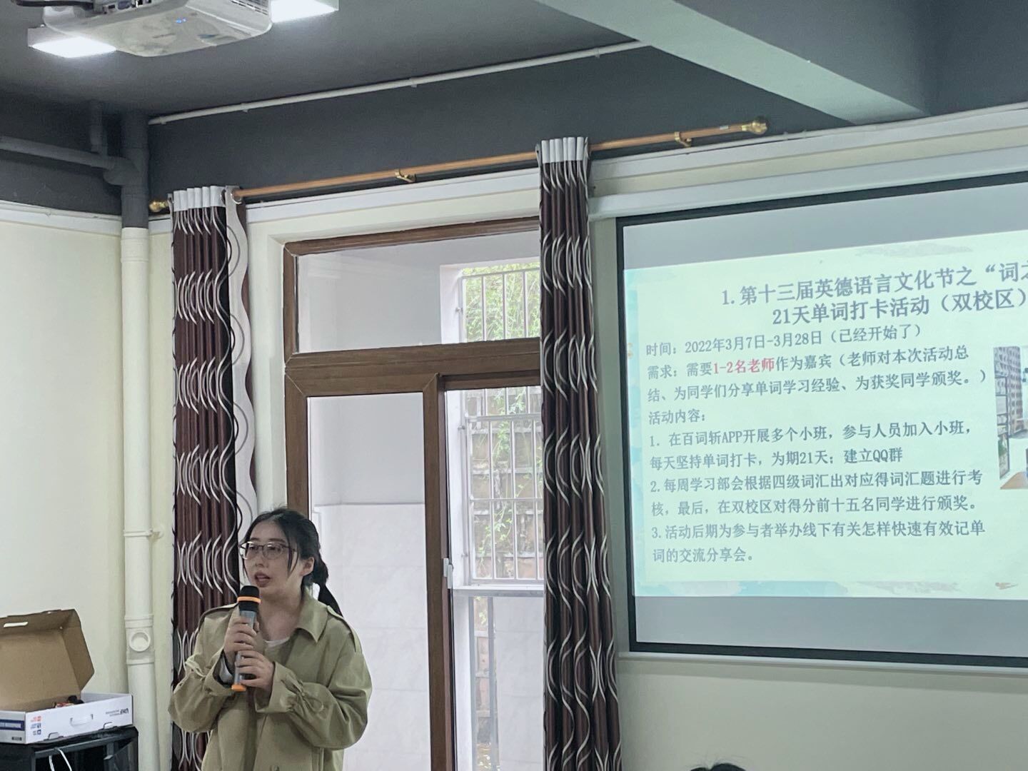 会议伊始,外国语学院社团指导板块老师兰鹰梳理本学期英德语言文化节的活动,理清思路,明确方向。