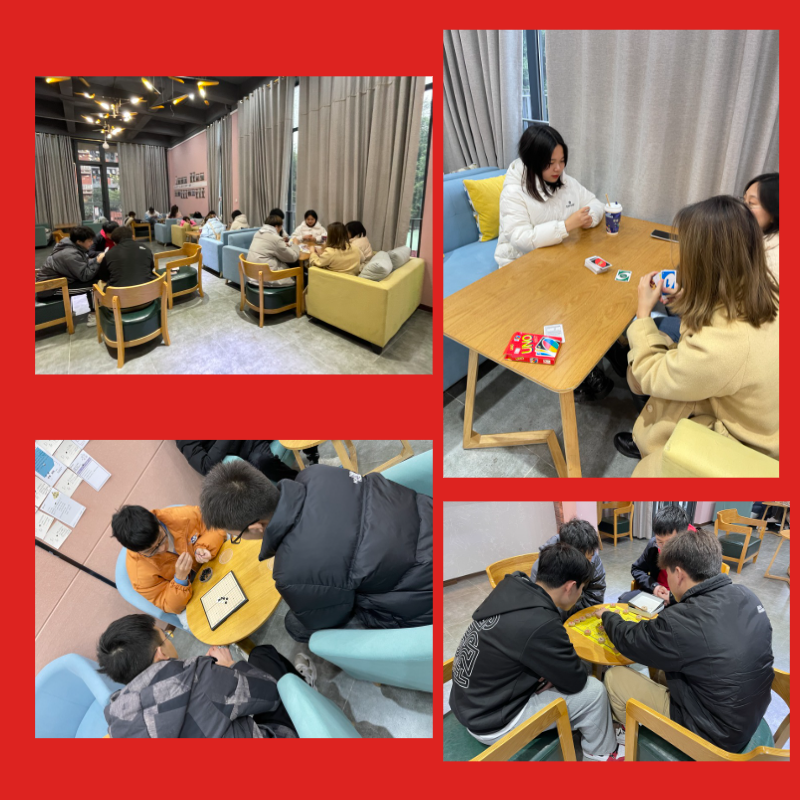 两位老师简单的介绍了一下活动的意义之后,同学们就根据自己的爱好进行自由组合分组,有的在玩三国杀、有的在玩大富翁,有的在玩UNO,有的在玩五子棋,有的在玩中国象棋。