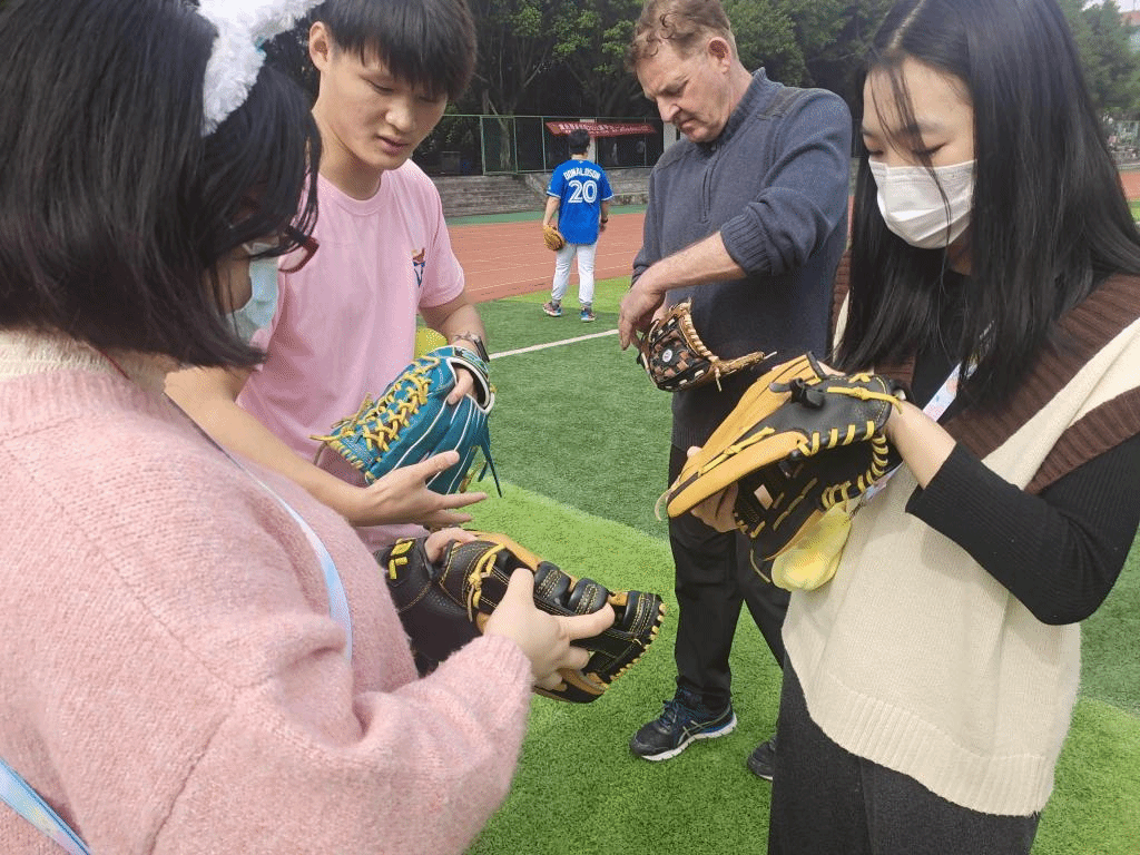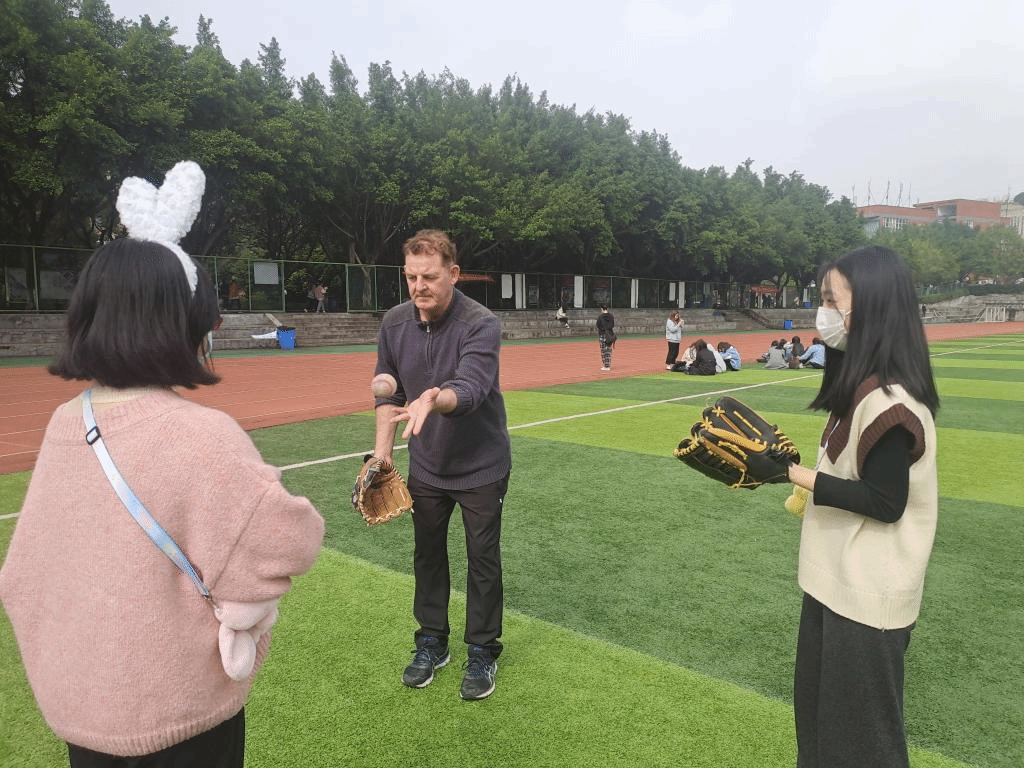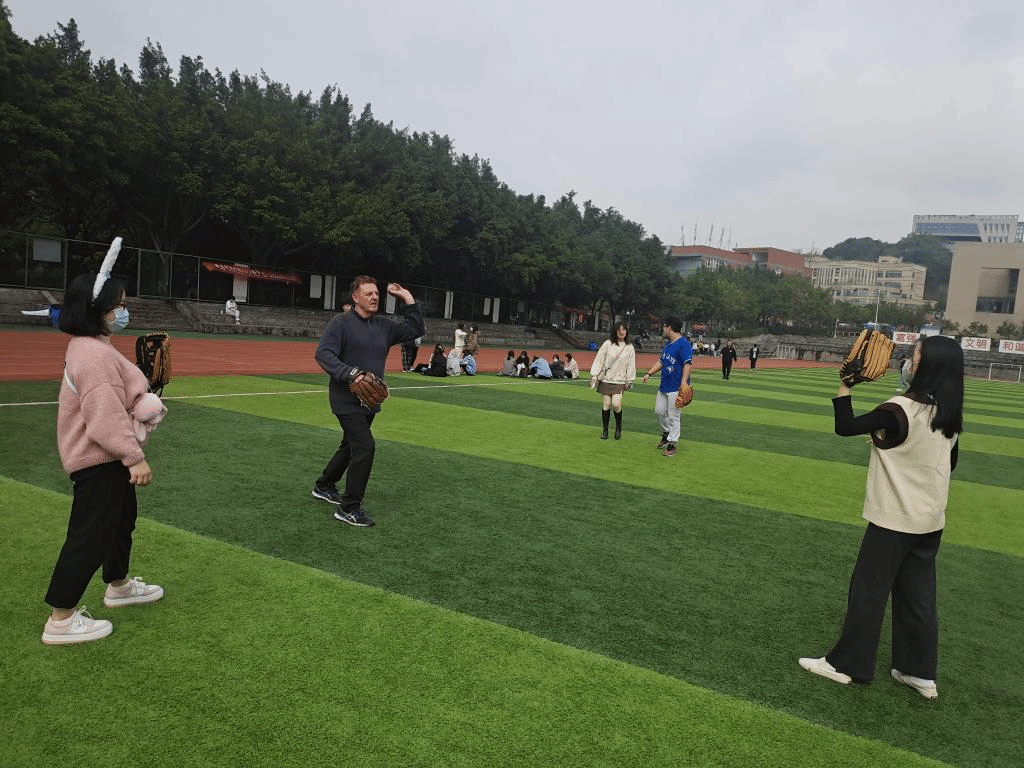 回忆起垒球英语角,戴银银同学说道:“第一次与外教Mike见面,并没有想象中交流的尴尬和口语的窘迫,即使口语表达不够流畅,Mike一直很热情,夸赞我们能够迈出英语沟通的第一步,他的鼓励让我们就放下了心里的大石头。” 短暂的热身活动之后,Mike用简单的英文为同学们介绍了垒球护具、穿戴方式和游戏规则等基本知识,大家迫不及待地戴上了护具,在Mike的带领下开启了垒球体验之旅。虽然投球时常失手、跑位也不规范,但同学们都玩得不亦乐乎。