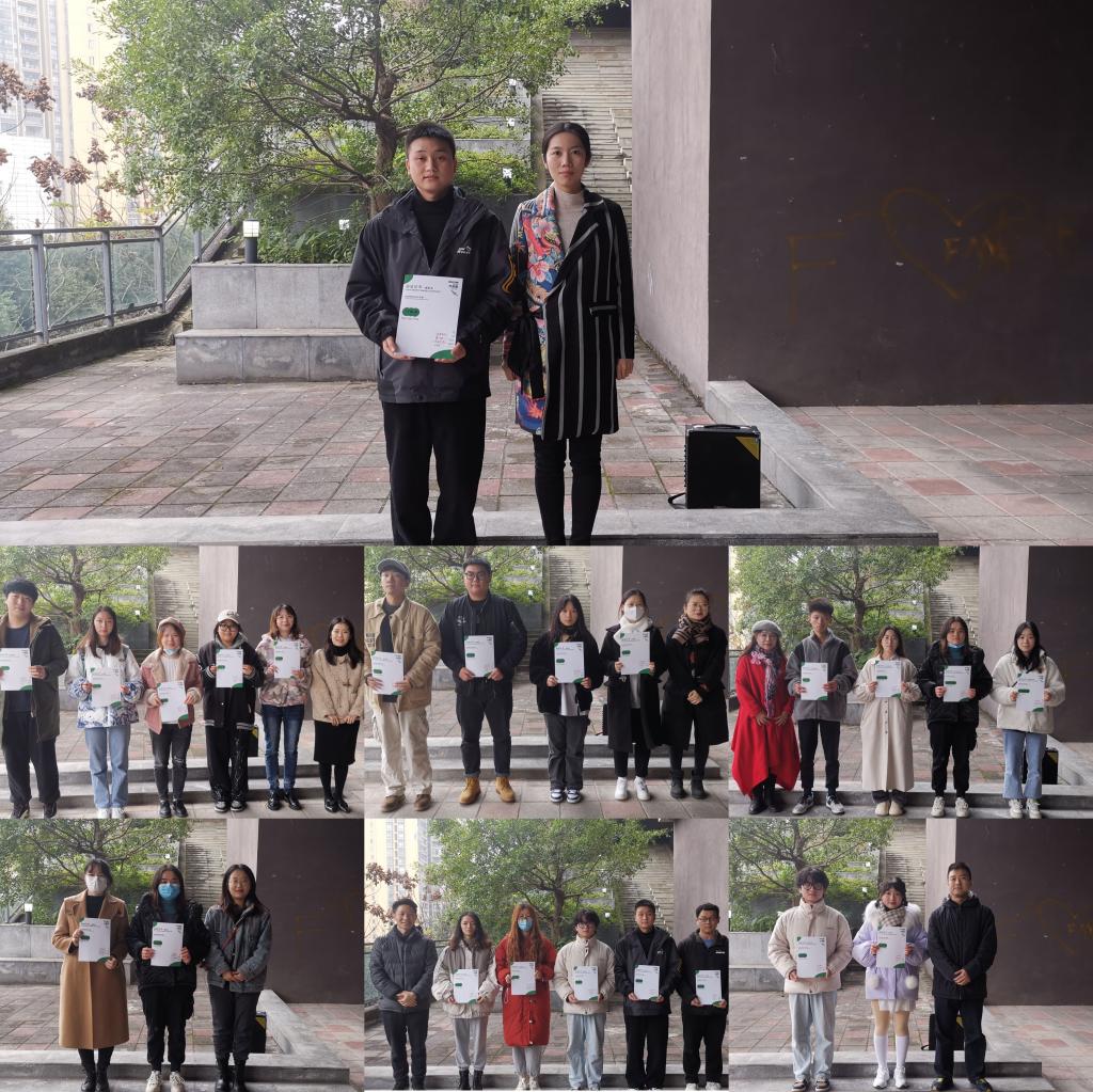 随后李轶天院长、李克伟副院长、创意写作学院毕然老师以及动画专业教师为获奖同学颁发证书并合影留念。此次课程优秀作品展包含“梦幻移通·彩绘校园”的写生课程作品一二三等奖、海报设计佳作奖、三维场景佳作奖以及场景模型佳作奖。