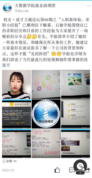 石敏校友在活动开始分享到:可能一开始很多人都不太瞧得起抖音和快手这种短视频的制作,毕竟这些技术和电影制作以及微电影的后期制作等等比起来逊色许多,如今抖音短视频成了网红app,这是一种大趋势,是5G时代的推动,由此告诉大家不要轻视任何一种职业。当面试求职的时候,首先对职业要有充分的了解,了解对面试者的要求以及此职业的发展趋势等,并且对公司的发展要有远见的卓识,不能因为表面就轻视自己所面试的职位。同学们问到“在面试中要注意什么呢?”,石敏校友告诉同学们稳重、细心是关键,学会稳中求胜。