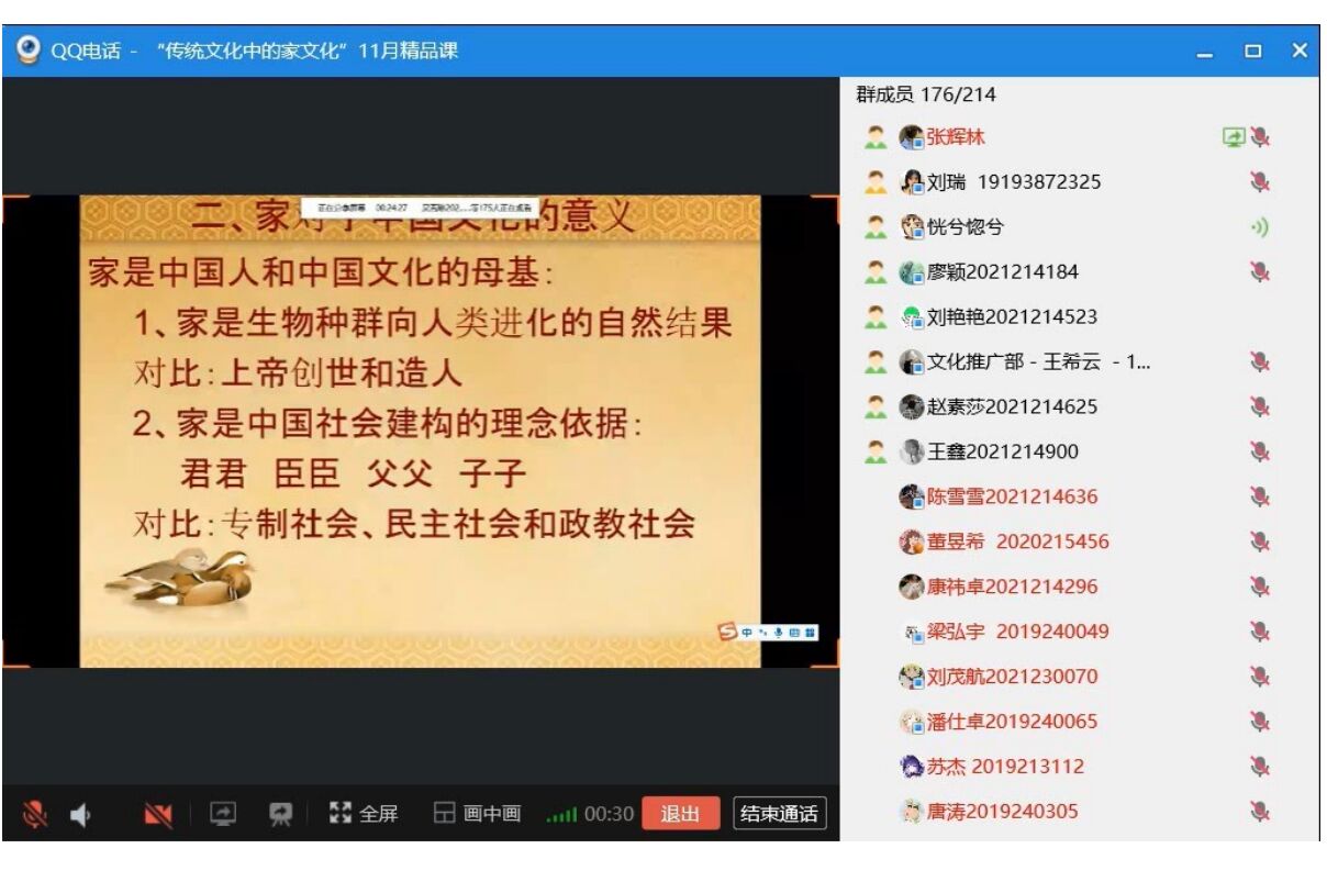 11月北山书院名誉院长王于飞教授以线上授课的形式,进行了以“传统文化中的家文化”为主题的精品授课。