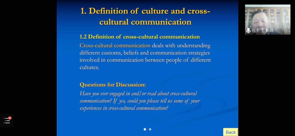 11月25日,天渠书院名誉院长刘承宇教授携精品课《英语学习与跨文化交际》通过腾讯会议以直播的形式与书院学子“云端”对话。刘教授从文化与跨文化交际的定义出发,深入浅出地为同学们讲解英语学习与跨文化交际之间的关系。刘教授勉励同学们,要规范英语学习计划,把日常英语学习与跨文化交际紧密结合起来,勤学多思,努力成为优秀的跨文化交际者。