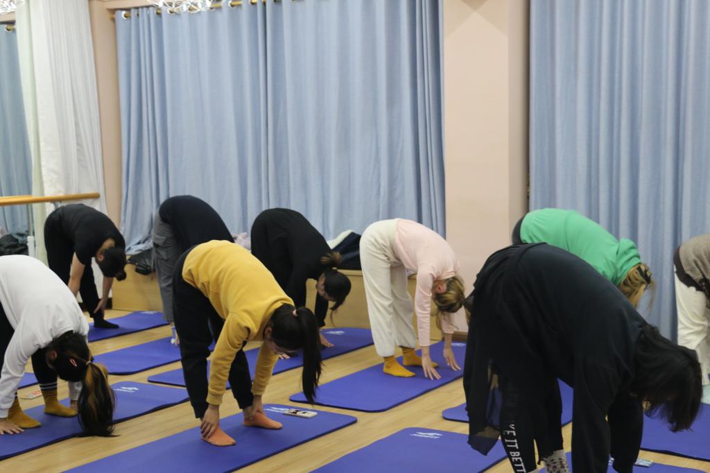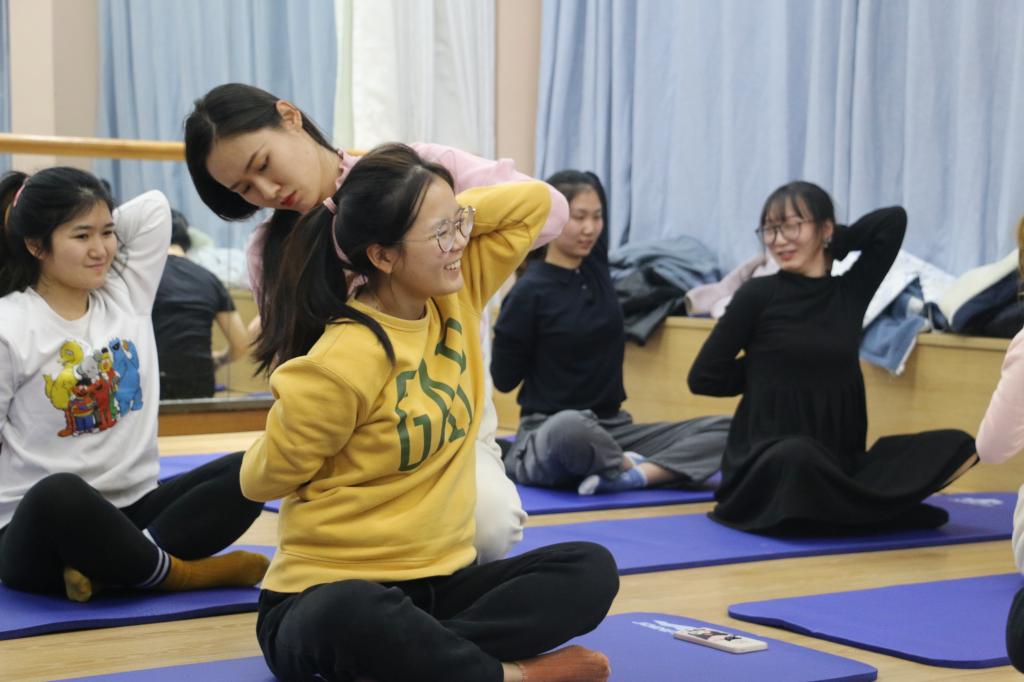 活动特邀李欣然学姐指导,为参与者讲解瑜伽相关知识并示范动作。伴随着轻柔的音乐,同学们在学姐的指导下一次次转换动作,或双手叉腰,转动身体部位,或缓缓起立,高举双手逐渐向下弯腰。在练习过程中由于大部分同学初次接触瑜伽,身体柔韧度不够,肢体僵硬而引发疼痛,动作不标准,但学姐仍旧耐心指导每一位同学,同学们也努力配合做到自己的极限。在“授” 与“受”的良性交流下,学姐和同学们双向互动共同完成瑜伽动作。