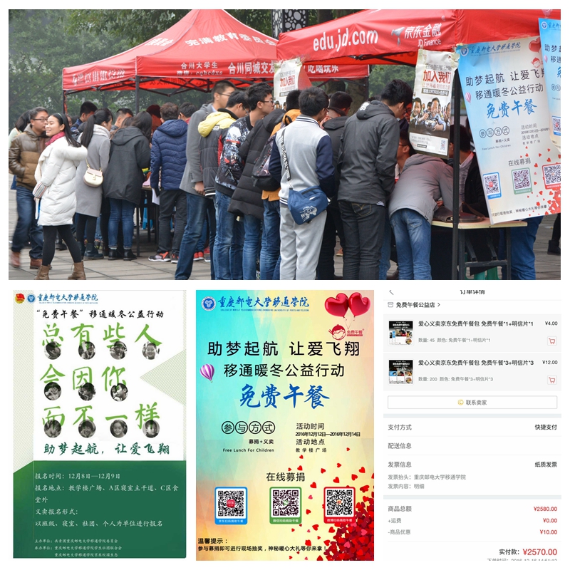 爱心在接力,我们在行动。2016年12月12日至13日,由重庆邮电大学移通学院学生社团联合会和京东校园生态联合承办的,以“助梦起航▪让爱飞翔”为主题的“免费午餐”移通暖冬公益活动在教学楼广场上展开。此次活动参与人数达800人次,截止12月13日,共为贫困山区儿童筹集午餐善款2582.6元,共募得午餐645份。
