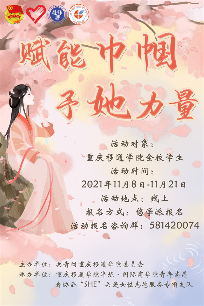 随着时代的发展,女性地位得到稳步提升,女性权益得到更多保障,众多独立女性汇聚成为一股“她力量”,推动社会迈向了“她时代”。为传递和壮大“她力量”,重庆移通学院淬炼·国际商学院青年志愿者协会在今年3月特成立SHE关爱女性志愿服务专项支队,成为“她力量”的一员。11月,淬炼青协携手SHE女性支队,在双校区开展了“赋能巾帼·予她力量”关爱女性特别活动,普及女性知识、挖掘女性故事、铺设卫生巾互助盒、为女性发声……1400余小时、800余名志愿者、400余片卫生巾、100余篇女性故事、80多个卫生巾互助盒、39份女性海报、6个短视频、1场专题讲座,让11月的移通,充满热情与感动,让两万余名移通er,真切感受到了“她力量”。