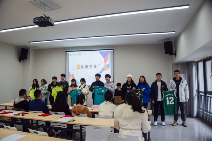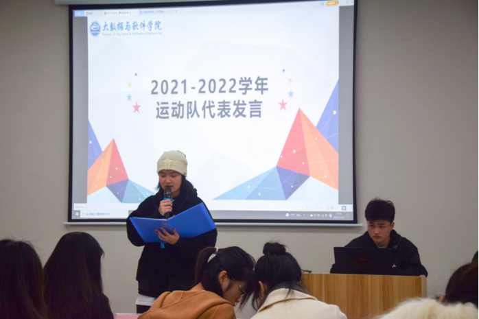 接下来老队长发言,讲述了对新队员的衷心祝愿和热烈的欢迎,遇到强敌不要害怕,更不要退缩,只要敢于直面强敌、努力拼搏,你想要的结果终会出现。新任女篮队长谭忻怡接过老队长的交接棒,这不仅是一个职位的传承,也是一种体育精神的继承,更是一份责任与担当。对于新队员来说,这是一个新的起点,自古后浪推前浪,新队员应该表现出更加崭新的一面,延续大数据与软件竞技体育辉煌。