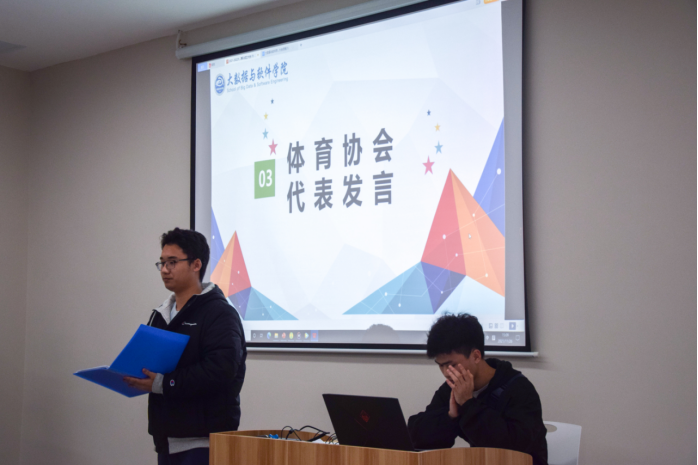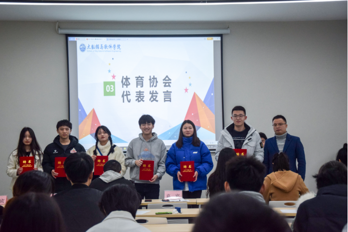 新老交替,精神传递。体育代表协会会长李陈杰在大会发言,讲述着一代老队员即将离去,新鲜血液将注入院队,离开的只是一位又一位带给许多荣誉的运动员,而留下的是他们顽强拼搏的精神。接着王焱老师为上一学年为学院取得优异成绩的队长颁发聘书,此聘书是对他们工作的肯定,同时也标志着大数据与软件学院体育代表队也将踏上新的征程。而后便是庄严的体育代表队新老队长交接仪式,传承是一个集体不可或缺的,团队想要走得更高,走的更远,就需要做好传承,队长将这重要的交接棒给了他们信任的后辈,希冀着他们能在这条道路上赛出更好的未来。