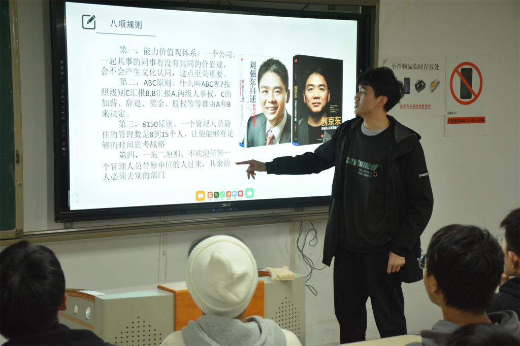 11月,机械教研室张鹏、周平和黄青青三位老师分别在课余时间于学校举办了本学期各自的第二次大咖阅读会。三位老师均为同学们分享了《刘强东崛起的智慧:强者必有强势的事业》。三位老师均对书中的精彩片段与同学们共同阅读,收获满满。